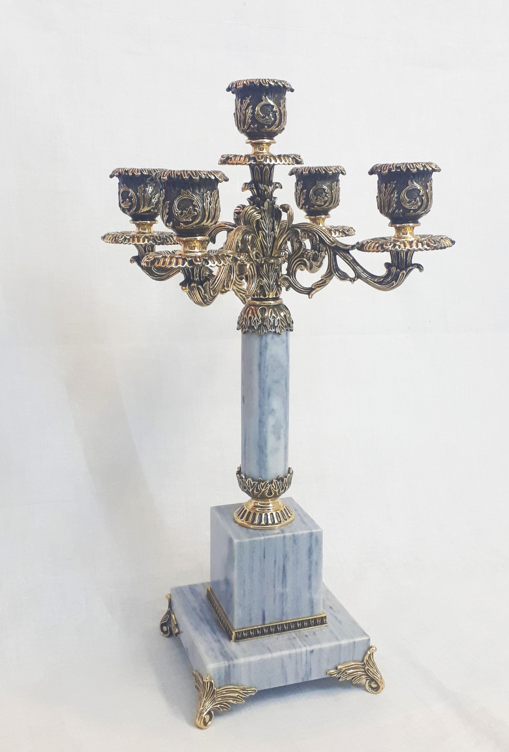 Представляем вашему вниманию эксклюзивный авторский канделябр на пять свечей, выполненный из высококачественной бронзы и натурального мрамора. Этот неповторимый предмет интерьера способен стать изысканным украшением любого помещения, придав ему уют, тепло и шарм классического стиля. Изящество форм, тонкость линий, богатство оттенков – все это делает наш канделябр истинным произведением искусства. Подарите себе и своим близким незабываемые моменты, отмеченные теплым светом свечей, мерцания которых станут еще ярче благодаря великолепию нашего канделябра. Дополните свой интерьер изысканной деталью, которая станет ярким акцентом комнаты и подчеркнет ваш превосходный вкус. |