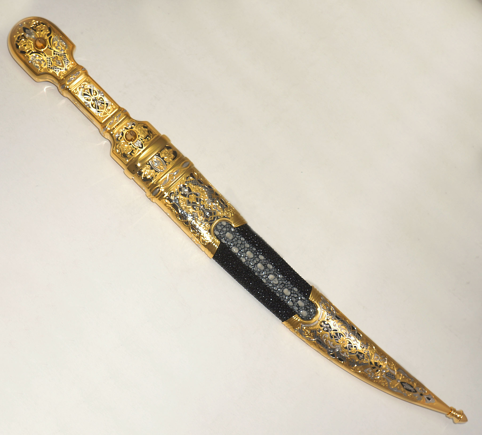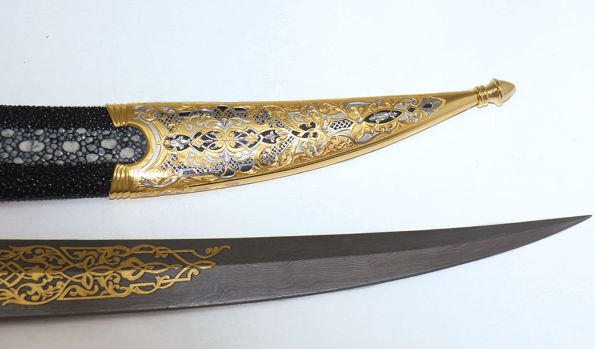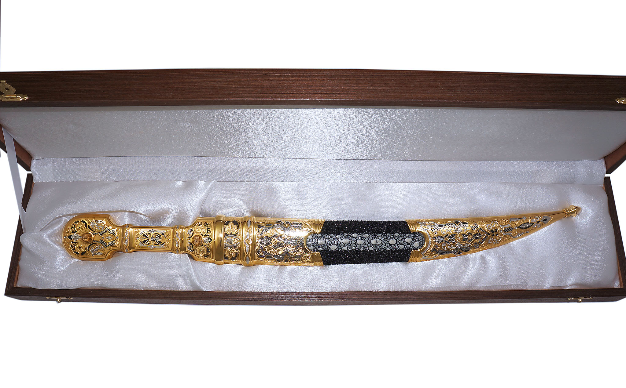 Мы рады представить вашему вниманию Бебут № 2, великолепный продукт наших мастеров-златоустовцев. Этот нож не только украсит любую коллекцию, но и станет незаменимым помощником в быту или на охоте. Бебут № 2 отличается превосходным качеством исполнения и рядом эксклюзивных особенностей. Он украшен по уникальной технологии златоустовской гравюры с золочением. Это дает неповторимый рисунок, который наполняет изделие ощущением роскоши и элегантности. Чехол для ножа выполнен из ценной кожи ската. Этот материал отличается высокой прочностью и долговечностью, а также неповторимым внешним видом.