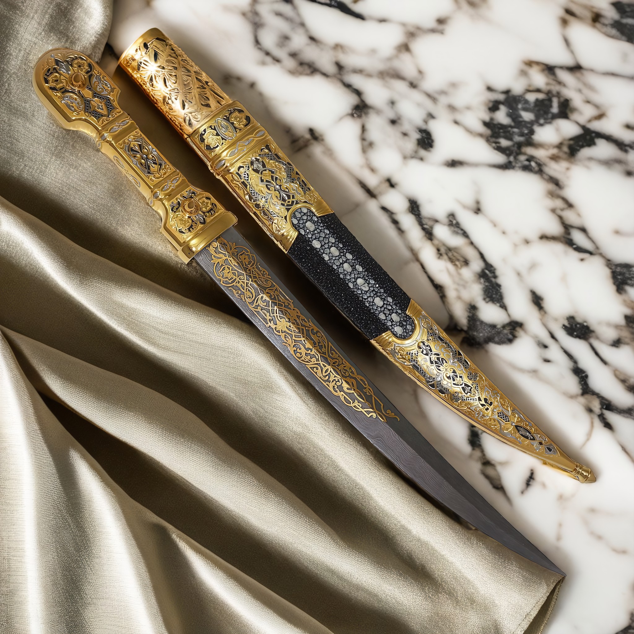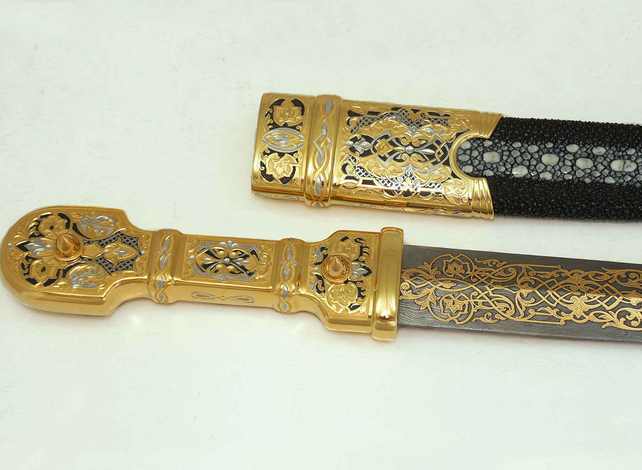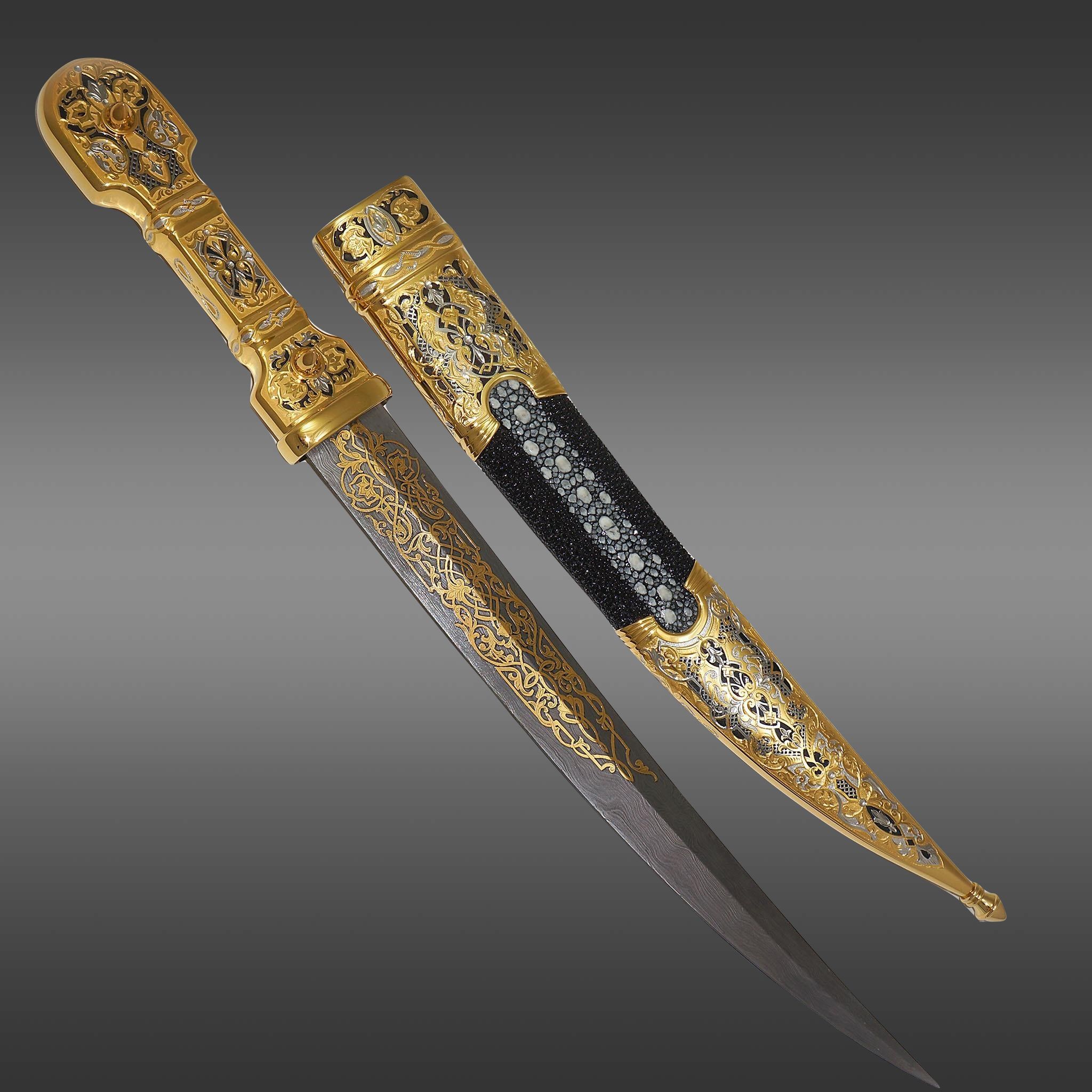 Мы рады представить вашему вниманию Бебут № 2, великолепный продукт наших мастеров-златоустовцев. Этот нож не только украсит любую коллекцию, но и станет незаменимым помощником в быту или на охоте. Бебут № 2 отличается превосходным качеством исполнения и рядом эксклюзивных особенностей. Он украшен по уникальной технологии златоустовской гравюры с золочением. Это дает неповторимый рисунок, который наполняет изделие ощущением роскоши и элегантности. Чехол для ножа выполнен из ценной кожи ската. Этот материал отличается высокой прочностью и долговечностью, а также неповторимым внешним видом.