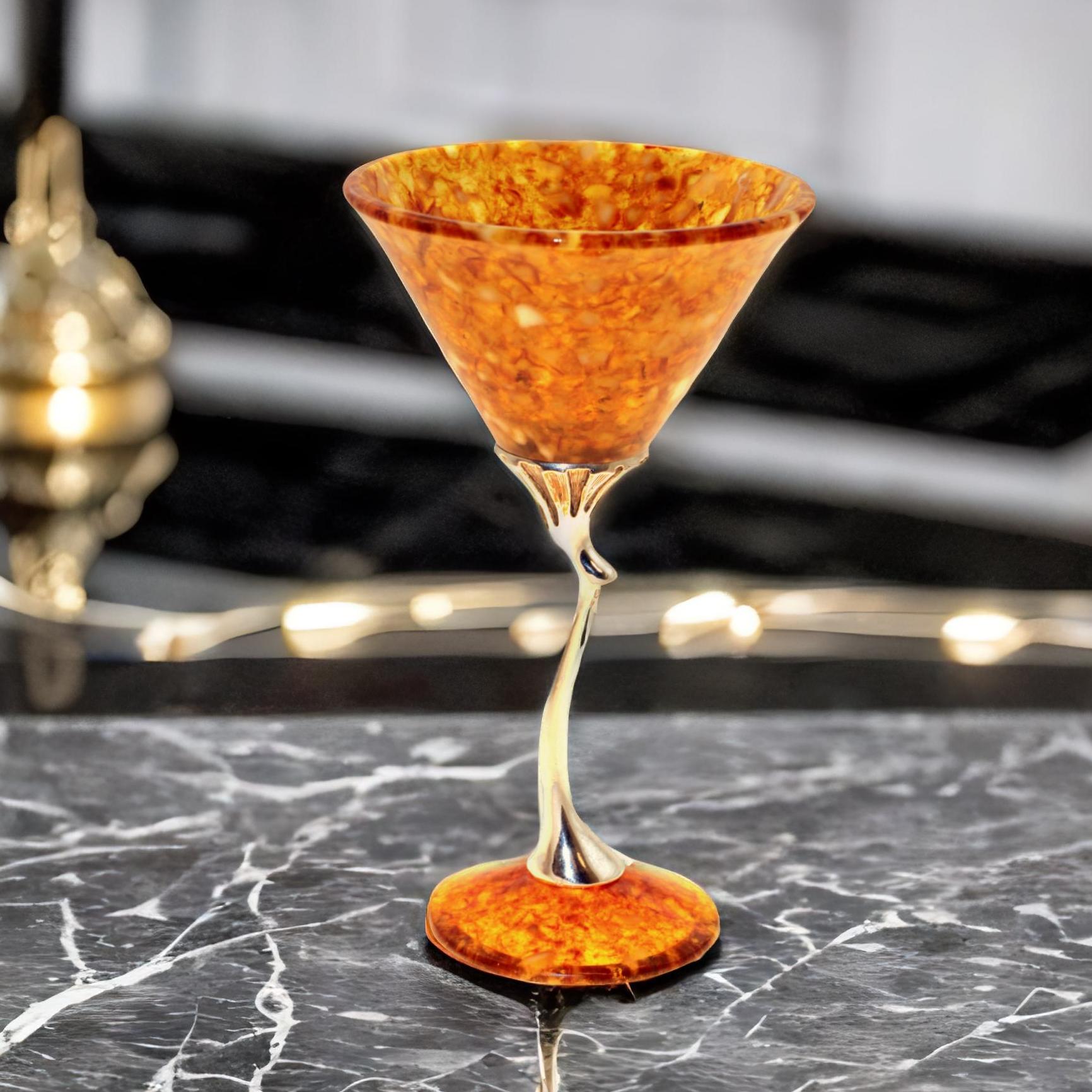 Сделайте ваше наслаждение коктейлем незабываемым! Представляем вашему вниманию эксклюзивный подарочный бокал для мартини, сделанный вручную из натурального янтаря. Элементы бронзы придают изделию элегантность и статус. Каждый бокал — это произведение искусства, которое порадует вас не меньше, чем любимый коктейль.