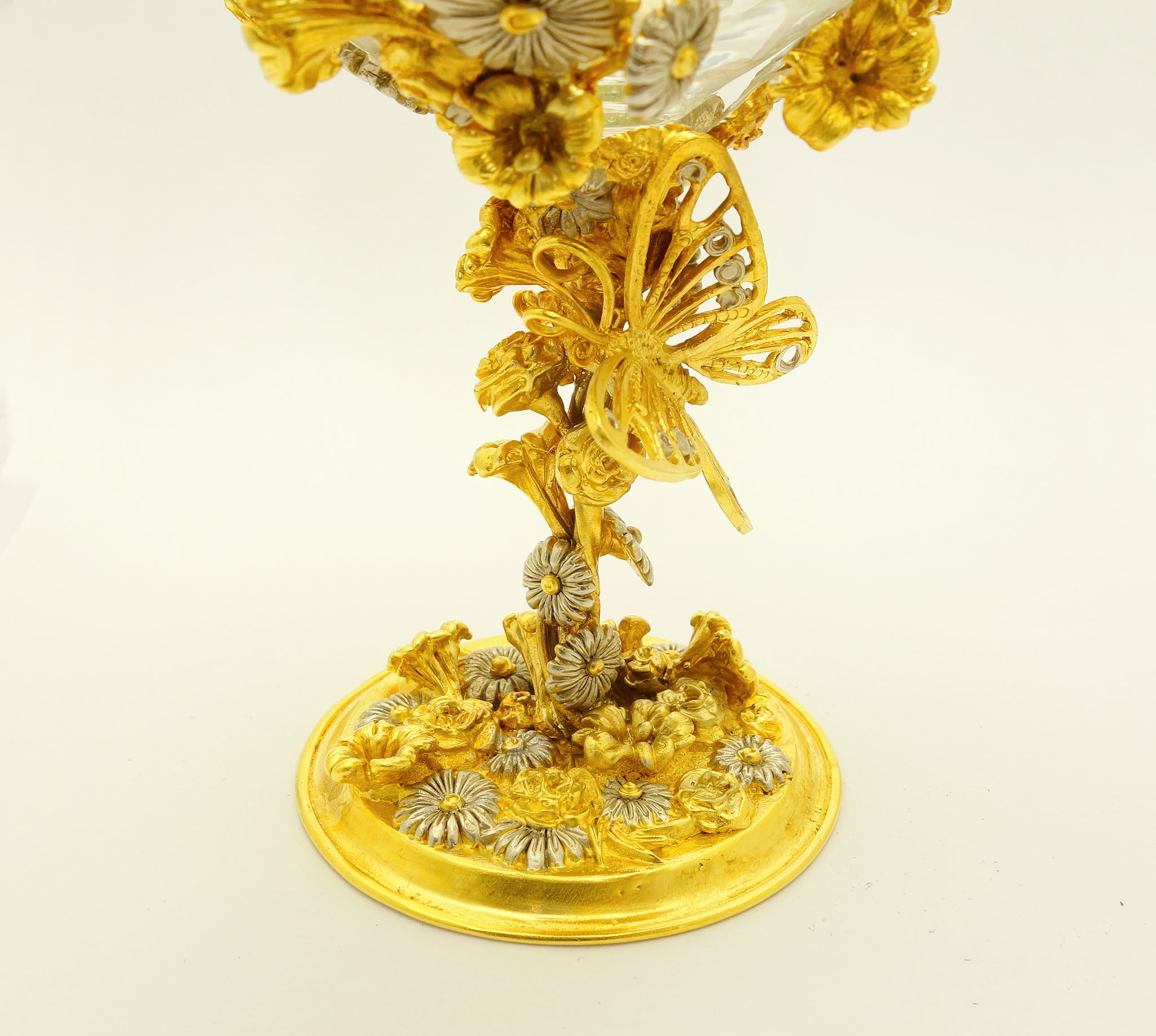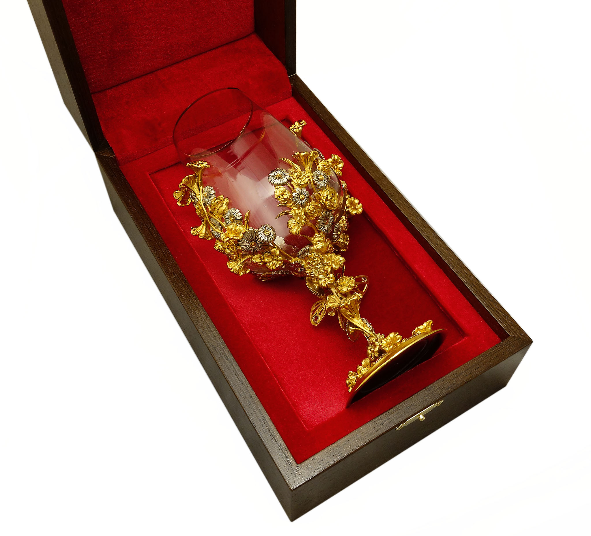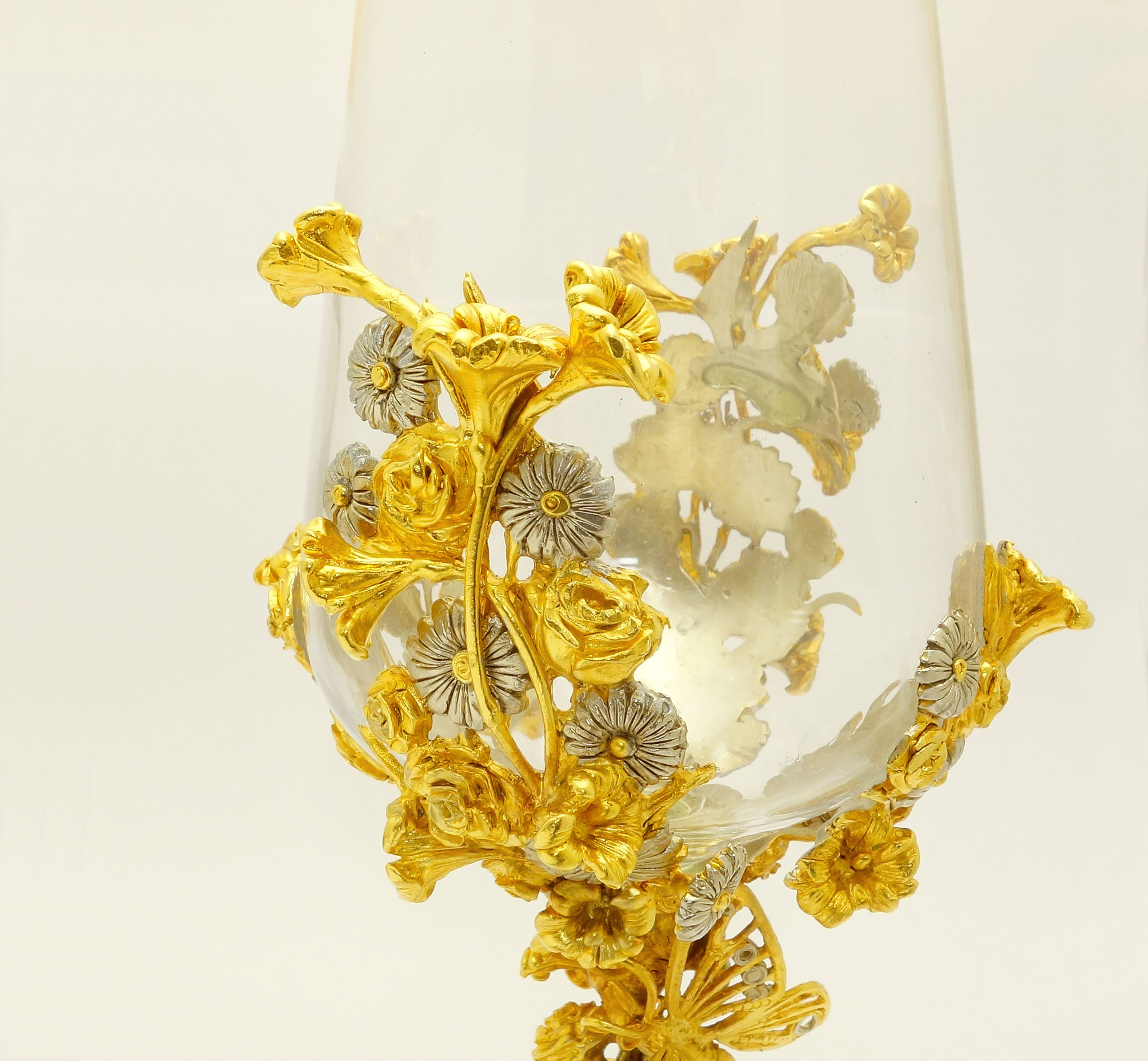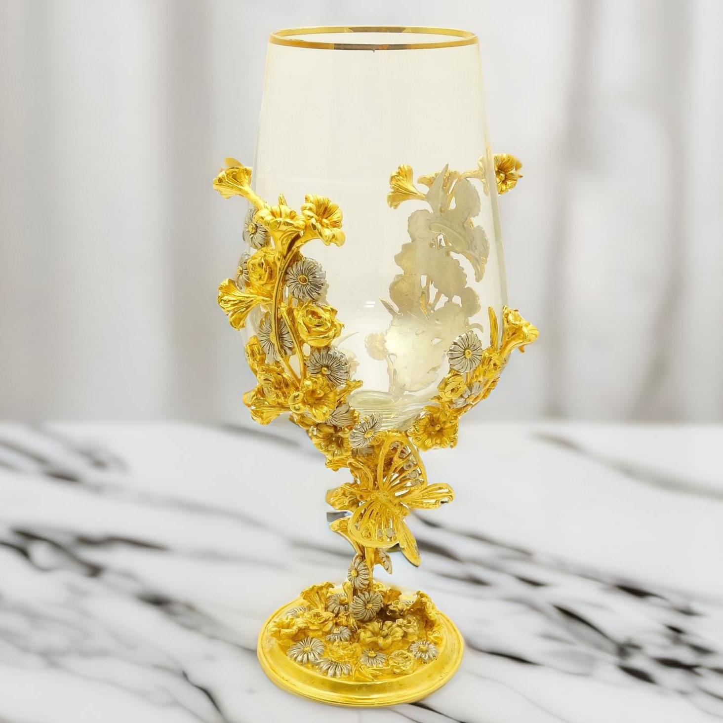 Представляем вашему вниманию эксклюзивный продукт — бокал для вина Фантазия. Этот бокал скрасит любой стол и подчеркнет вкус утонченного напитка. Особенность нашего бокала Фантазия в том, что он выполнен из бронзового литья с позолотой и декорирован в виде бабочки с цветами. Необычное сочетание материалов делает его не просто сосудом для вина, но и настоящим произведением искусства.