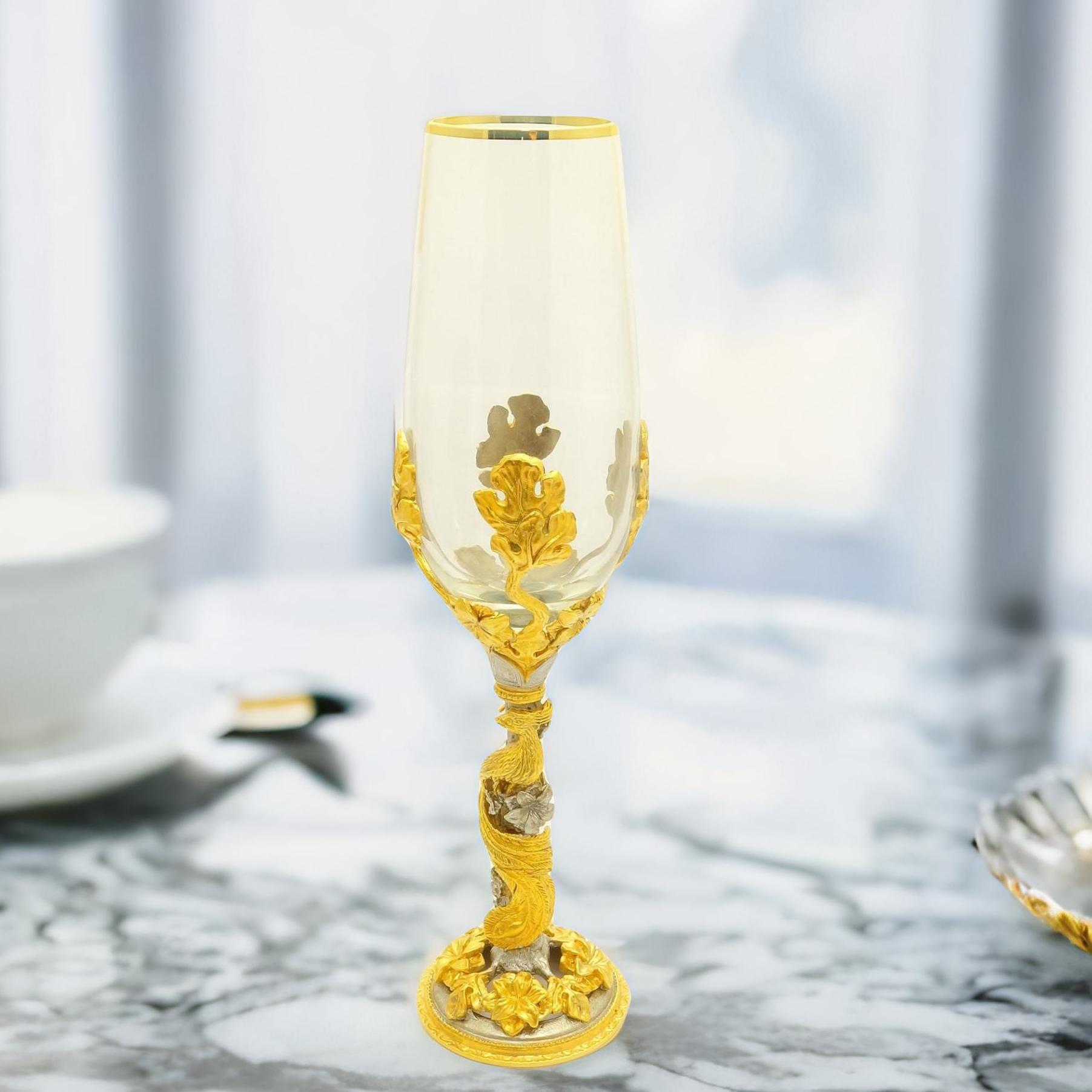 Представляем Вашему вниманию эксклюзивный товар — бокал Жар-птица! Эта поистине роскошная вещица станет идеальным подарком для Ваших близких или оригинальным украшением интерьера. Бокал Жар-птица выполнен из бронзового литья с позолотой в виде изящной и загадочной жар-птицы. Благодаря великолепному искусству литья, позолота покрывает бокал равномерно, подчеркивая каждую деталь дизайна.