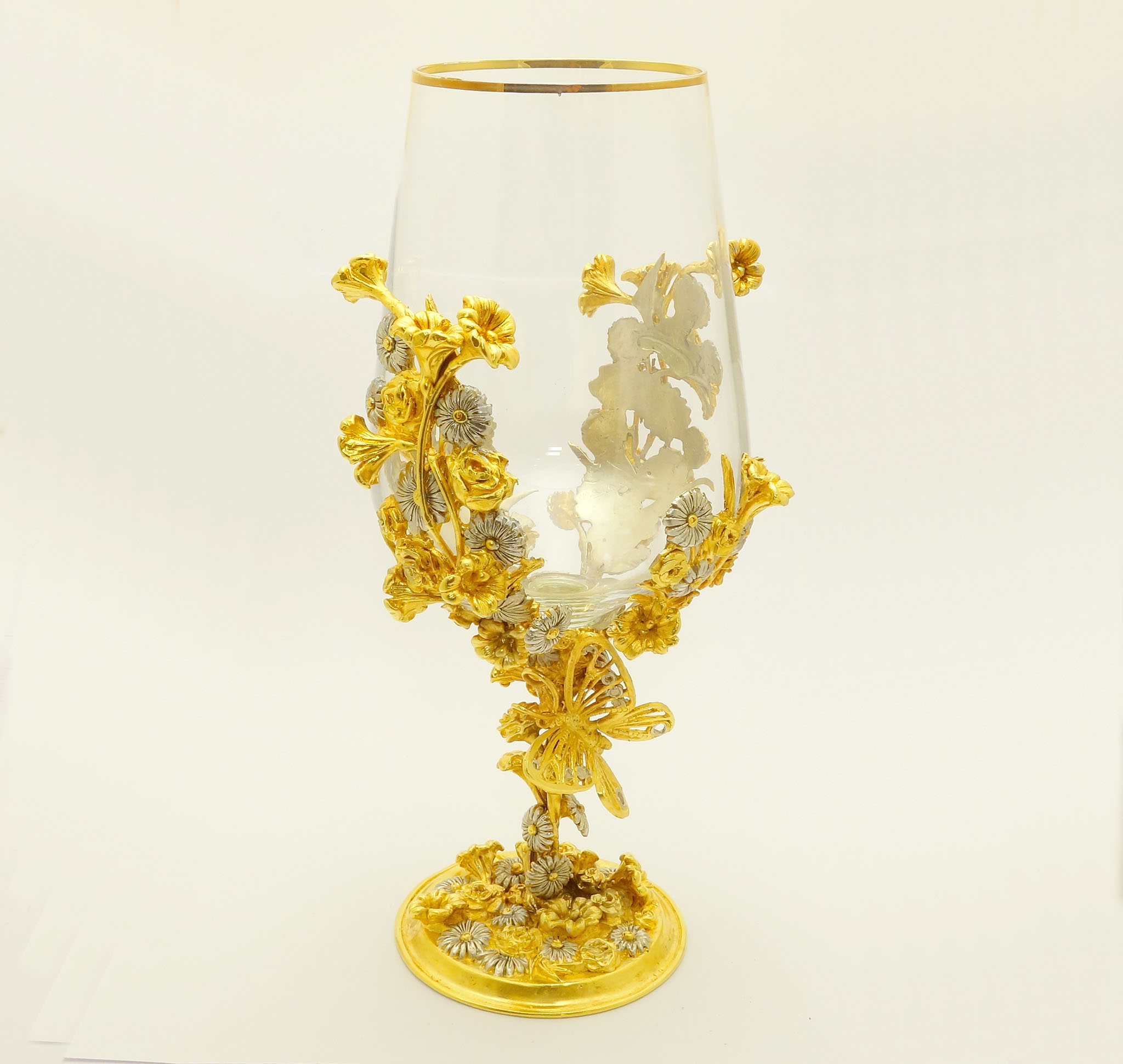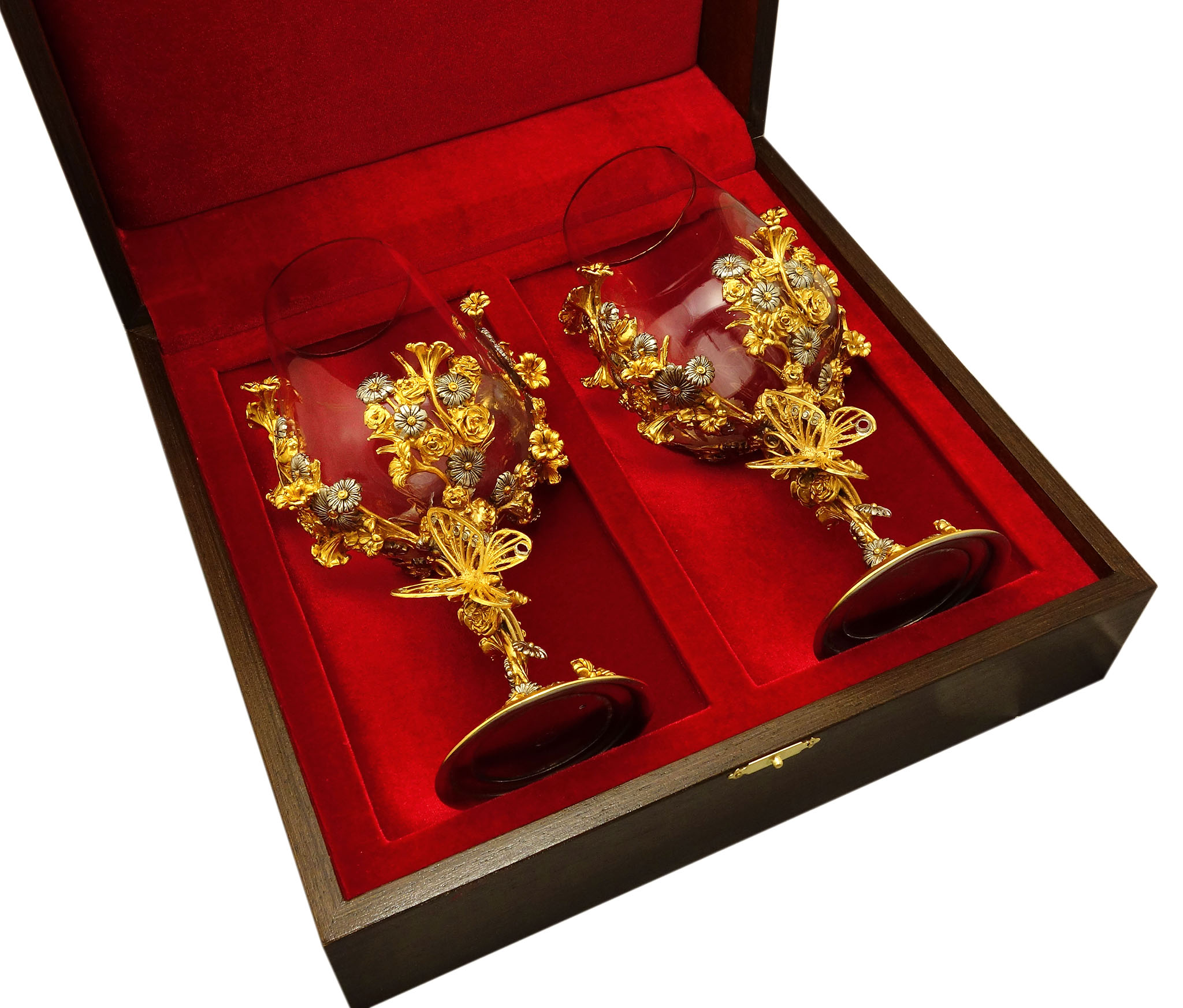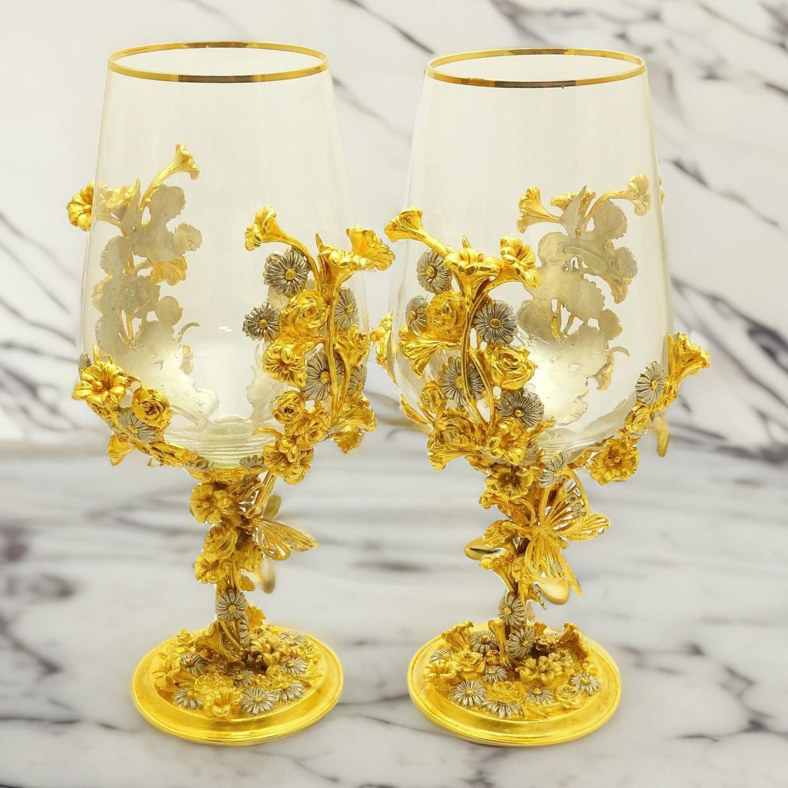 Представляем вам эксклюзивные бокалы для вина Фантазия! Тщательная работа литья из бронзы с разноплановыми элементами, окутанными лёгкой позолотой, превратила бокалы в настоящее произведение искусства. Важно отметить, что особое внимание уделялось изящному изображению бабочки, окруженной цветами.