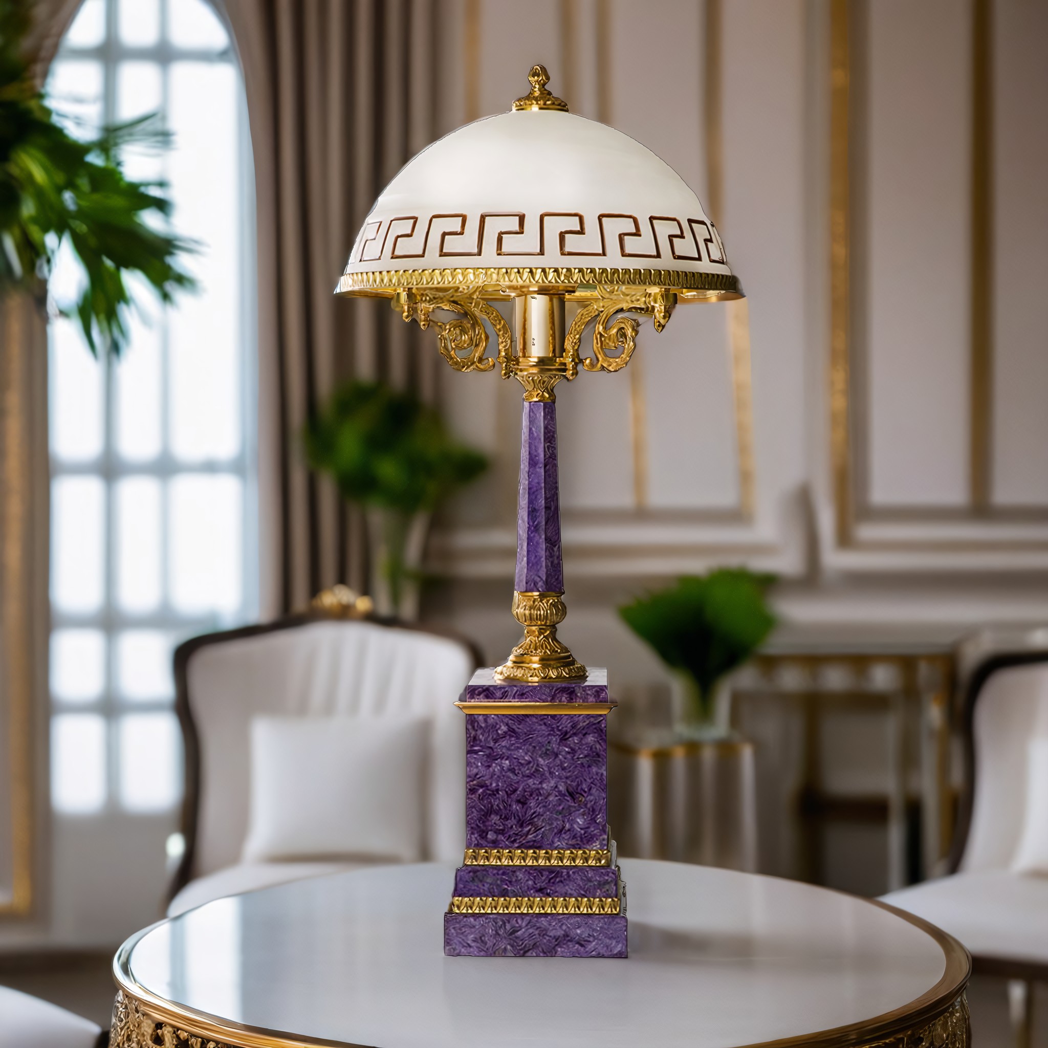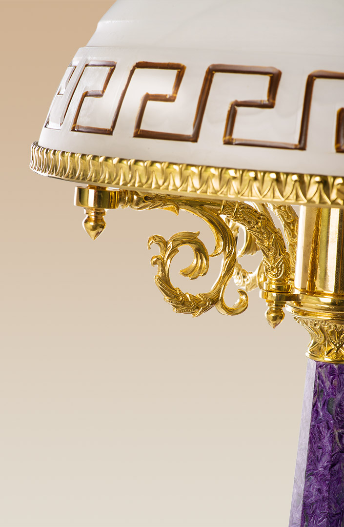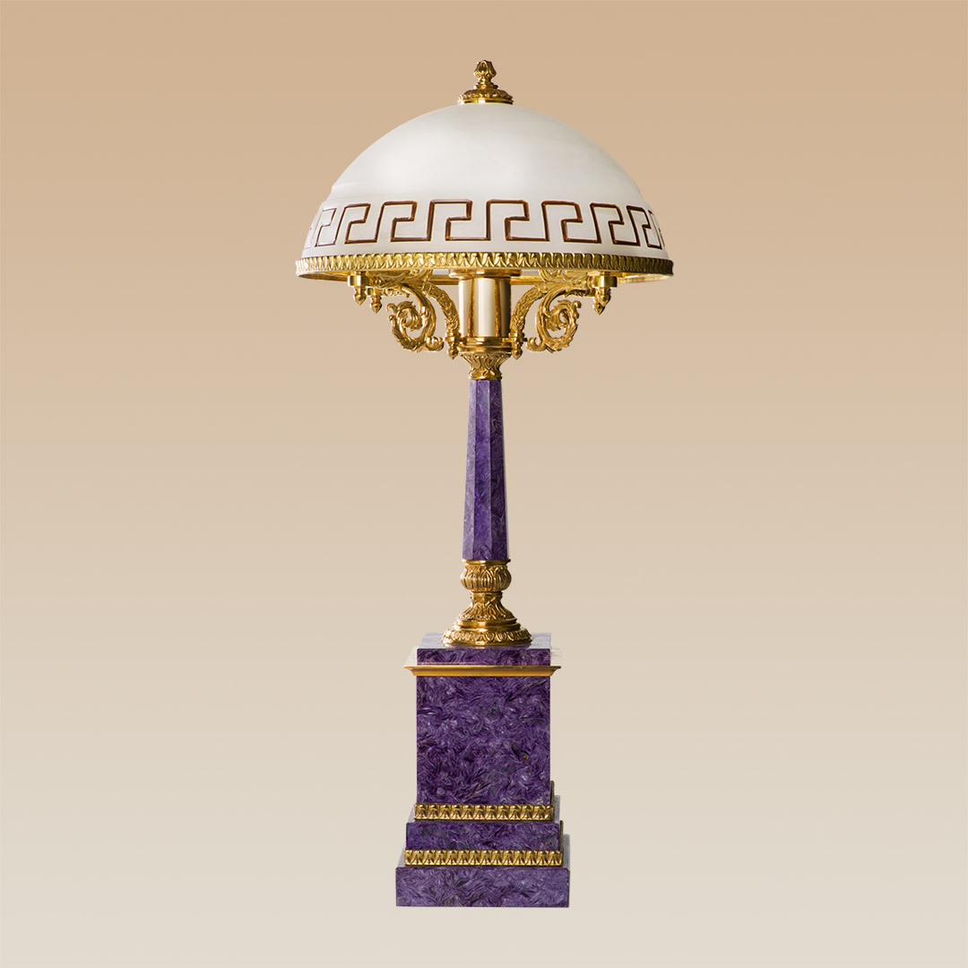 Настольная лампа изготовлена из удивительной красоты минерала — чароита, известного своими насыщенными сиреневыми оттенками. Благодаря классическому дизайну, лампа хорошо впишется в пространство, как жилое, так и офисное. Благородство натурального камня подчеркивается солидностью бронзы.
