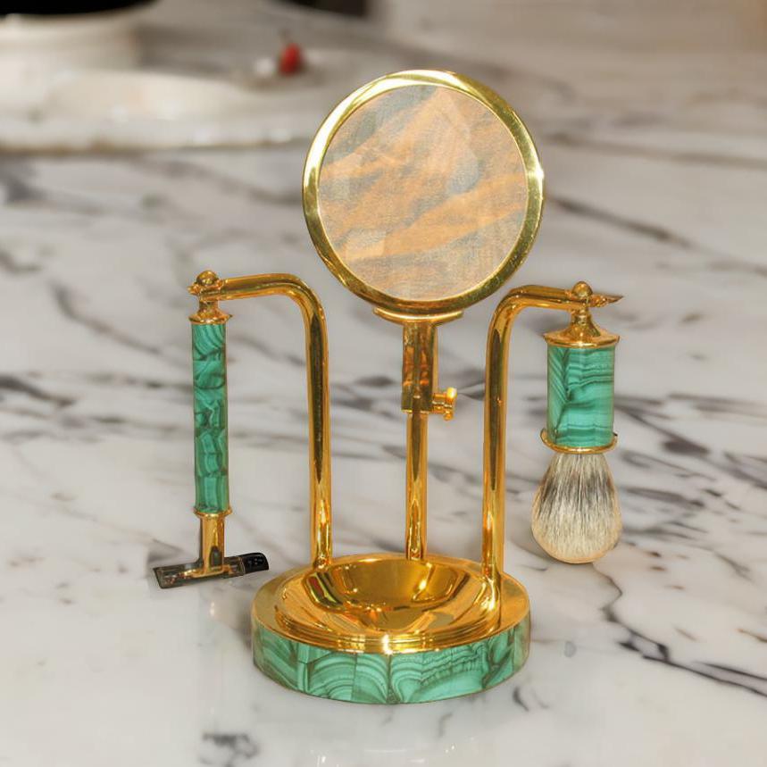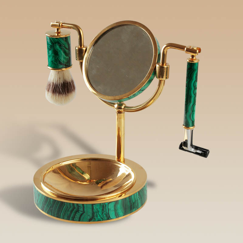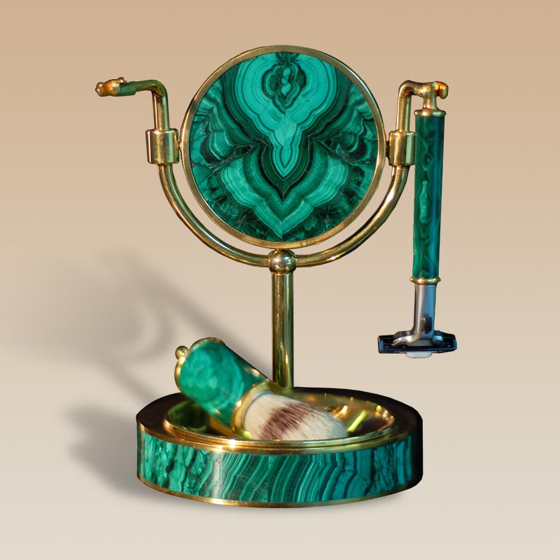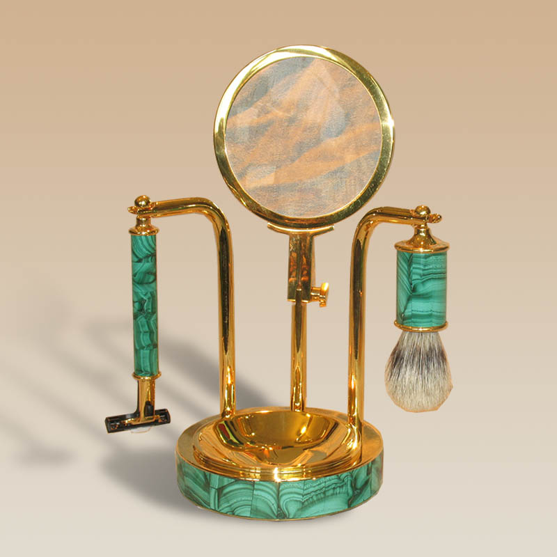 Стильный бритвенный набор станет настоящим предметом восхищения для каждого представителя сильного пола. Набор полностью функционален, выполнен из изысканного сочетания чистой бронзы и природного малахита. Оборотная сторона зеркала может быть декорирована памятной надписью.