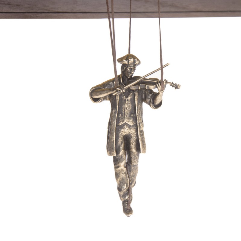 Кукловод в широкополой шляпе с улыбкой управляет двумя марионетками - грациозной балериной и скрипачом. Эпатажный артист в узорчатой рубашке, руки которого усеяны браслетами, а шею украшает большой медальон, увлечен своим привычным действом, но его марионетки словно живут отдельно от того, кто так ловко манипулирует их судьбами. Так, прекрасная балерина, вероятно, танцует под грустную мелодию бедно одетого музыканта, а, быть может, напротив, грусть его мелодии навеяна большим чувством любви и именно она творит изящный танец хрупкой танцовщицы. Восхищающая, будоражащая фантазию, удивительная картина невероятно жива, ведь даже легкое дуновение ветра или случайное прикосновение приводят марионеток в танец. |