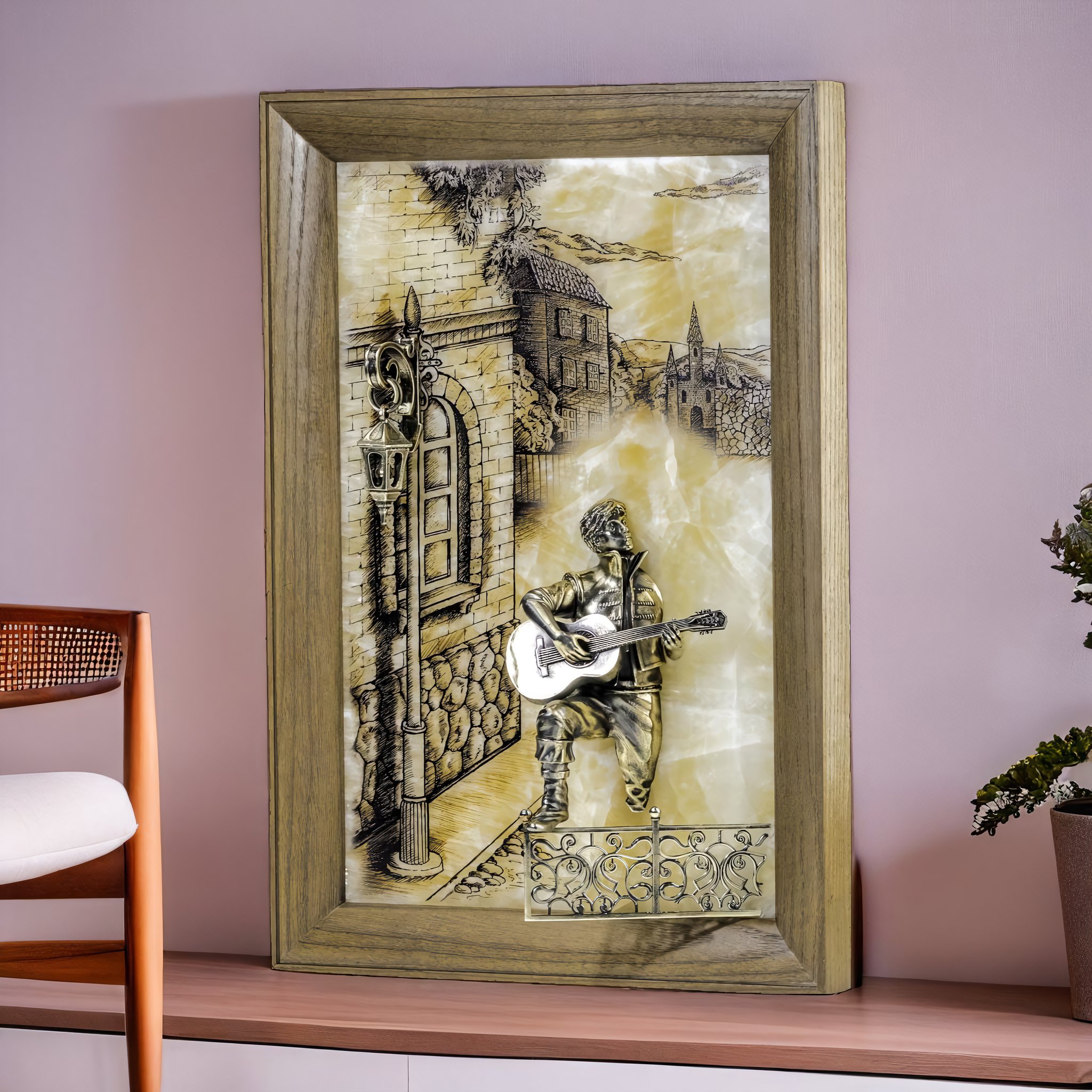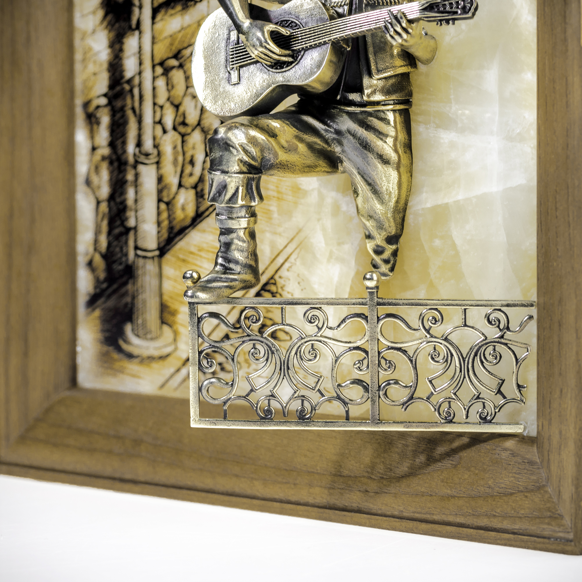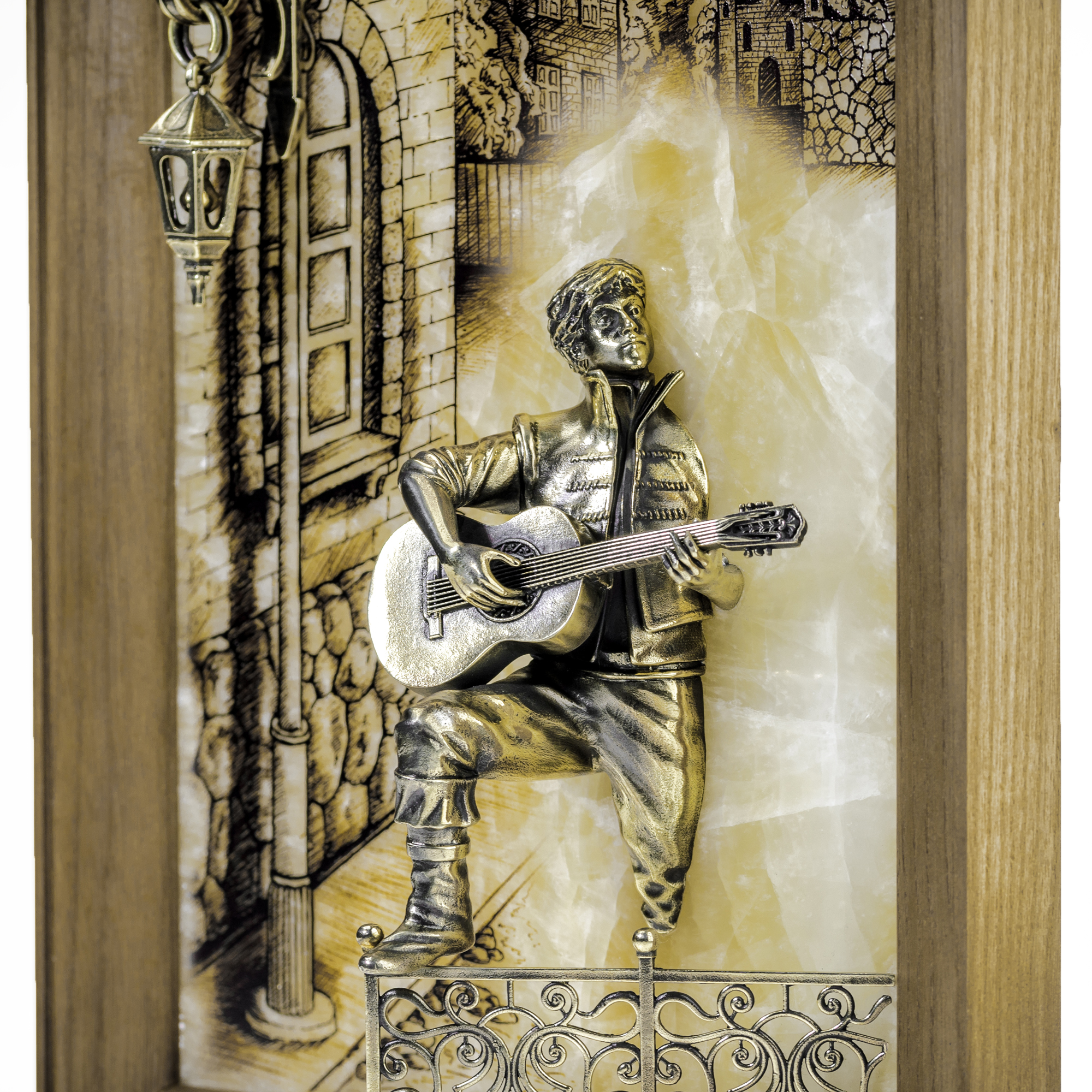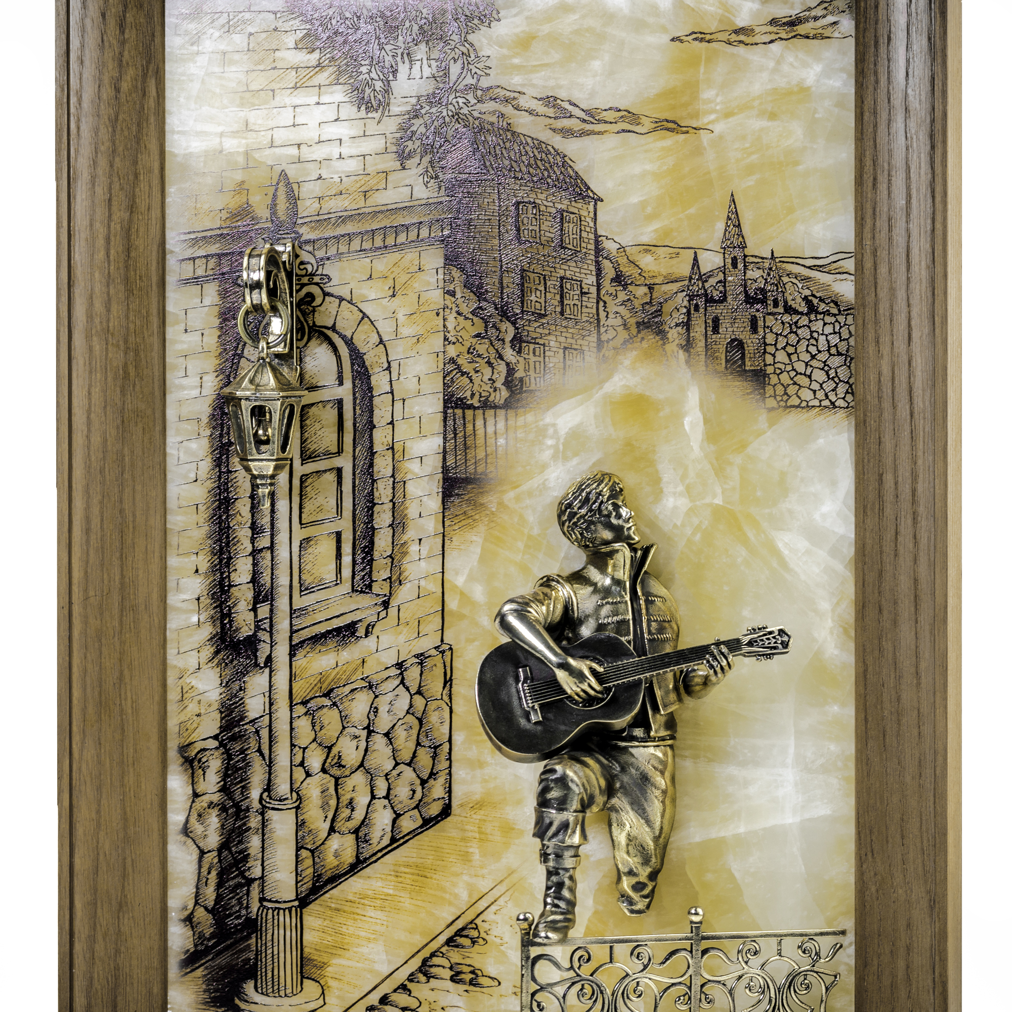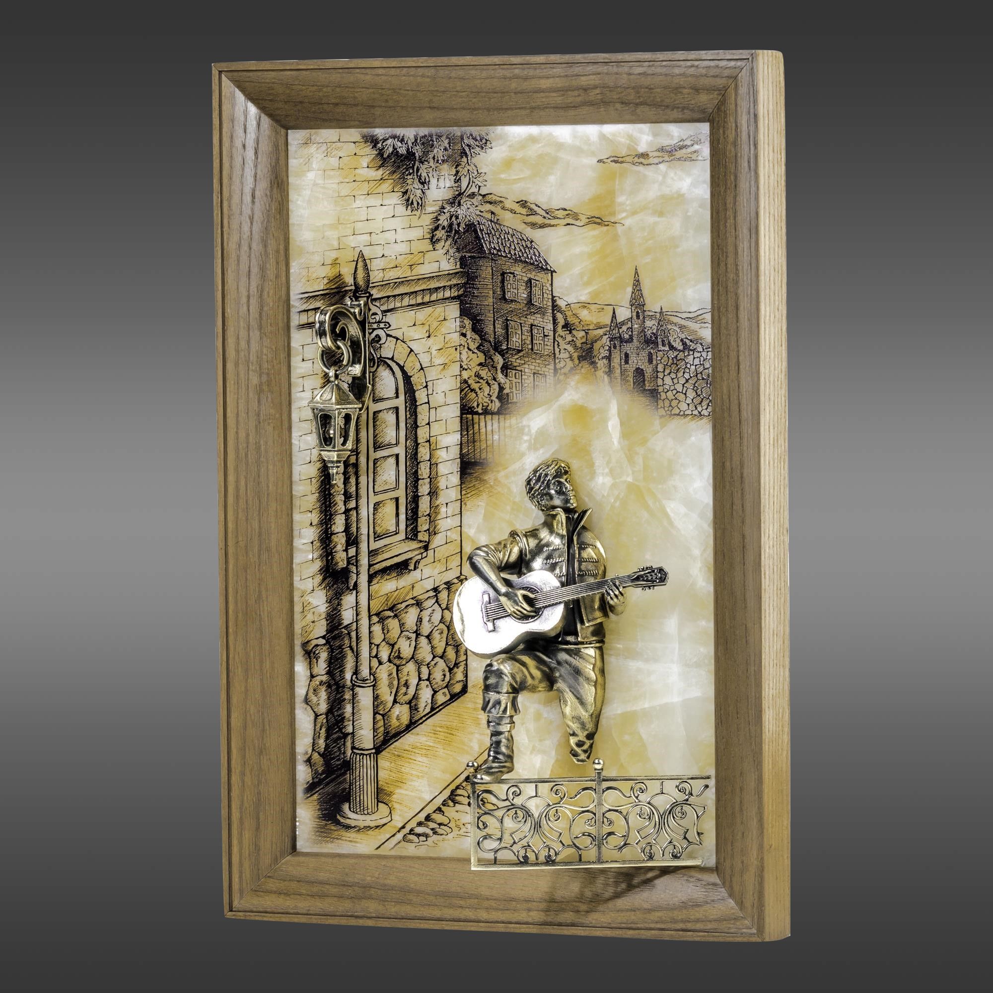 Прохладный вечер окутал улочки старинного городка. Влюбленный парень с гитарой поет серенаду для своей возлюбленной. Взгляд его, полный надежды и любви, обращен к дому своей избранницы. Волнующую мелодию, подаренную прекрасной возлюбленной, словно дополняет стук его сердца. И кажется, что герой картины оживает на теплом фоне волшебного оникса. Романтичная композиция, выполненная вручную, украсит интерьер и наполнит его душевным теплом. |