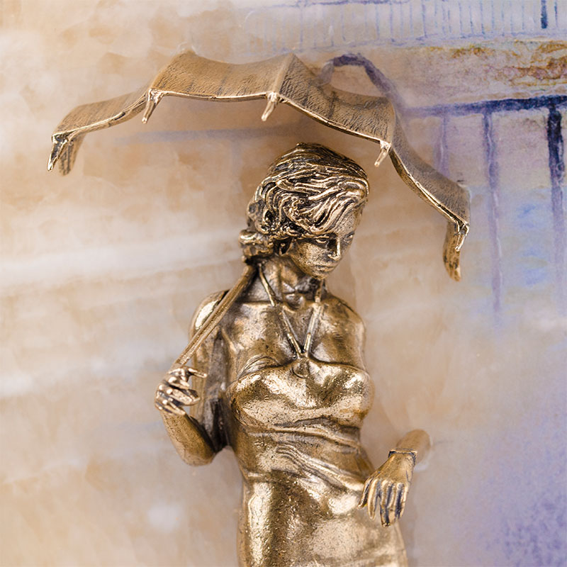 Бронзовая картина "Связь времён. Девушка с зонтиком" с росписью и подсветкой