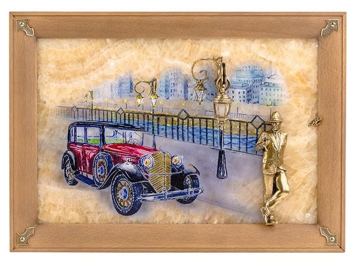 Будто сквозь время возник сюжет этой картины. Молодой человек на раритетном автомобиле с розой в руке ждет свою возлюбленную на набережной. На заднем плане виднеются многоэтажные современные дома. Картина повествует о том, что во все времена главным чувством остается любовь. |