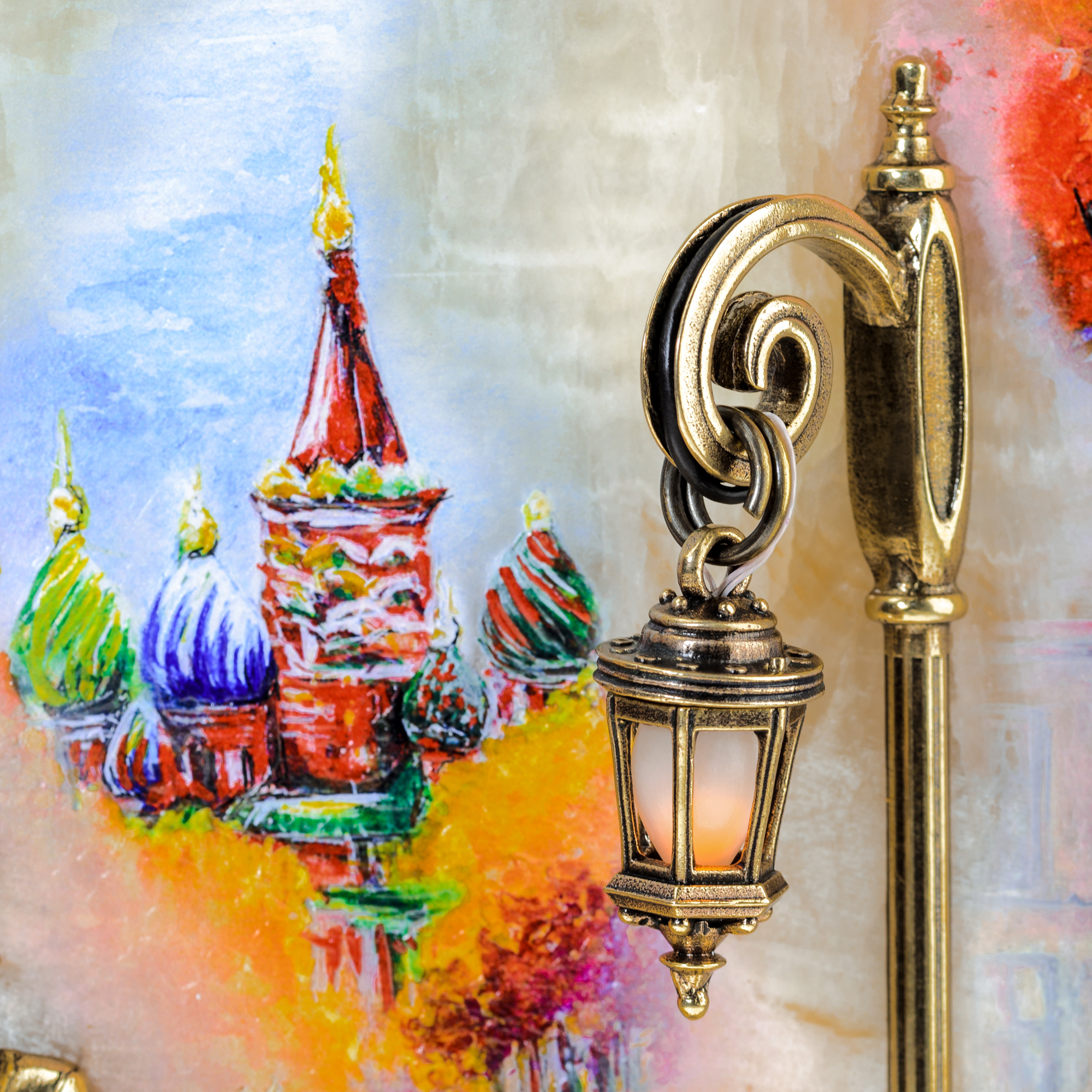 Осенняя пора делает златоглавую столицу еще прекраснее, дополняя прохладный вечер багряными красками всевозможных природных оттенков. Галантный кавалер ведет с дамой сердца увлеченную беседу, прогуливаясь по живописной аллее. Вдалеке виднеется столь узнаваемый образ расписного Храма Василия Блаженного, так гармонично сливающегося с красотой природы. Еще мгновение, и на резной скамейке под старинным фонарем с настоящей волшебной подсветкой прозвучит любовное признание, которое соединит два любящих сердца. |