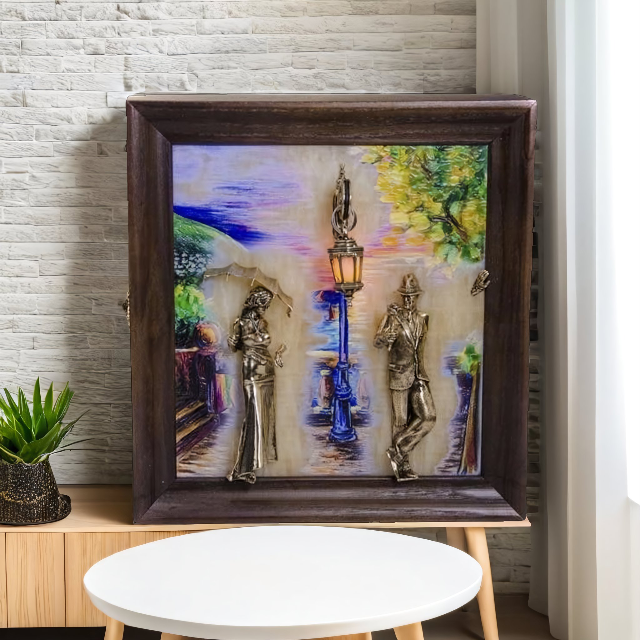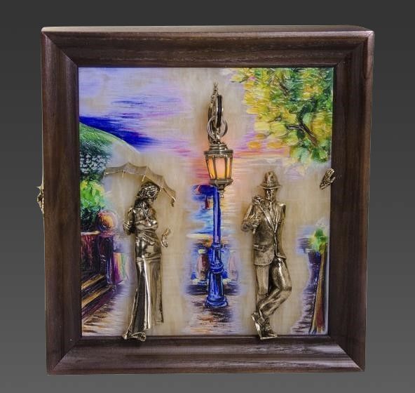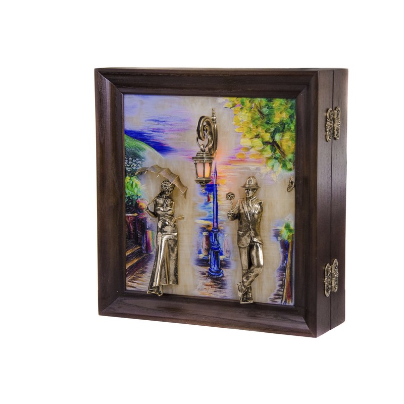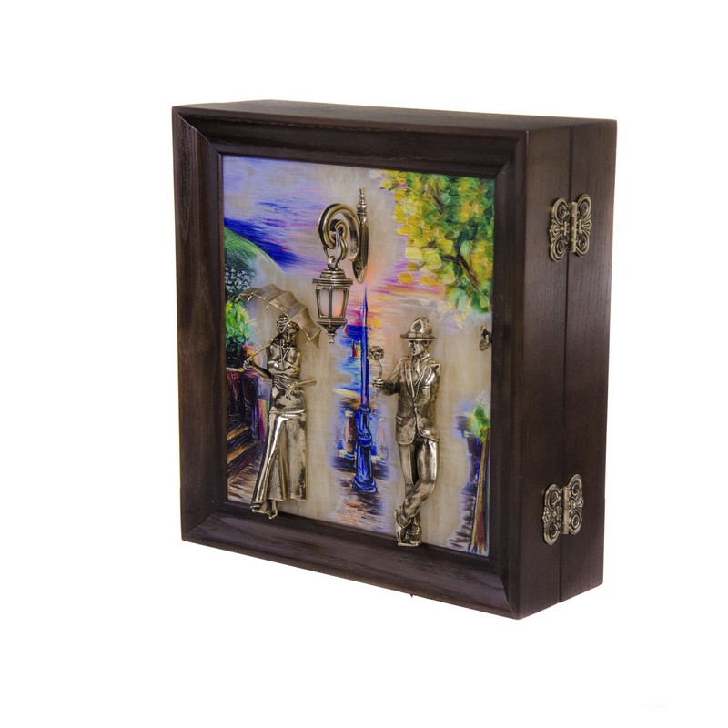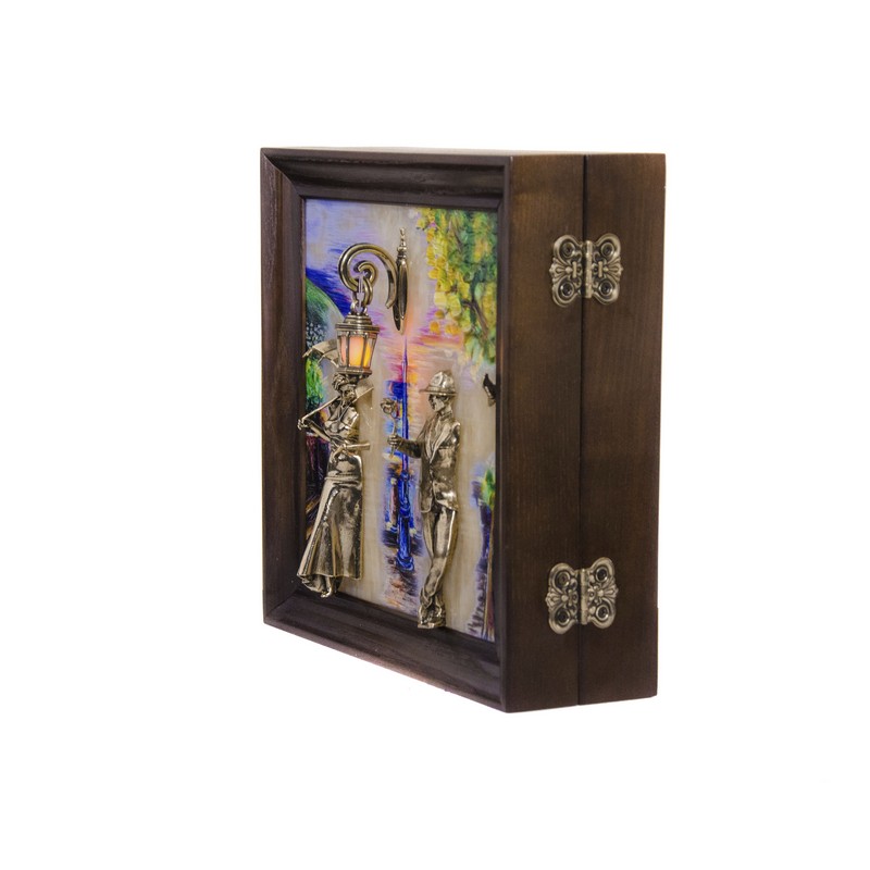 Необыкновенная ключница в виде открывающейся объемной картины, на которой изображено свидание двух влюбленных на живописной набережной в месте встречи под старинным фонарем с настоящей мерцающей подсветкой. Прекрасная незнакомка с волнующими изгибами фигуры томно поглядывает на часы на своем хрупком запястье, ожидая от нерешительного кавалера с розой предложения. Еще мгновение, и он скажет ей самые важные слова в своей жизни, и они, конечно же, будут о любви. |