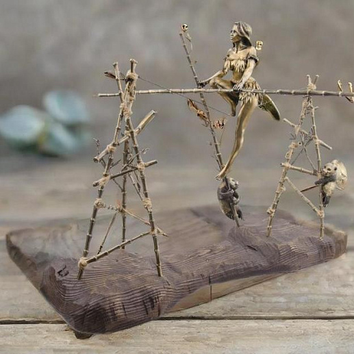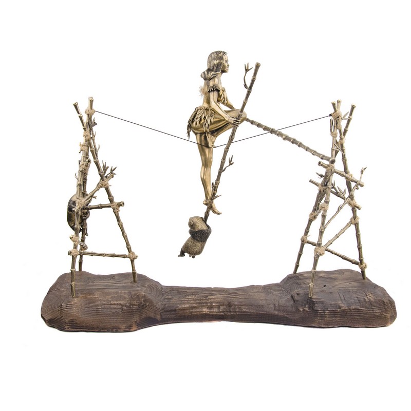Эта очаровательная бронзовая композиция «Балансирующая девушка с пандой» представляет девушку, уверенно балансирующую на канате с бамбуком в руках. Ниже ее, две игривые панды развлекаются, придавая сцене особую живость и непосредственность. Произведение искусства великолепно передает легкость и грациозность движений девушки, а также несет в себе атмосферу игры и радости от общения с природой. Эта композиция будет идеальным подарком для любителей изысканного искусства и природы. |