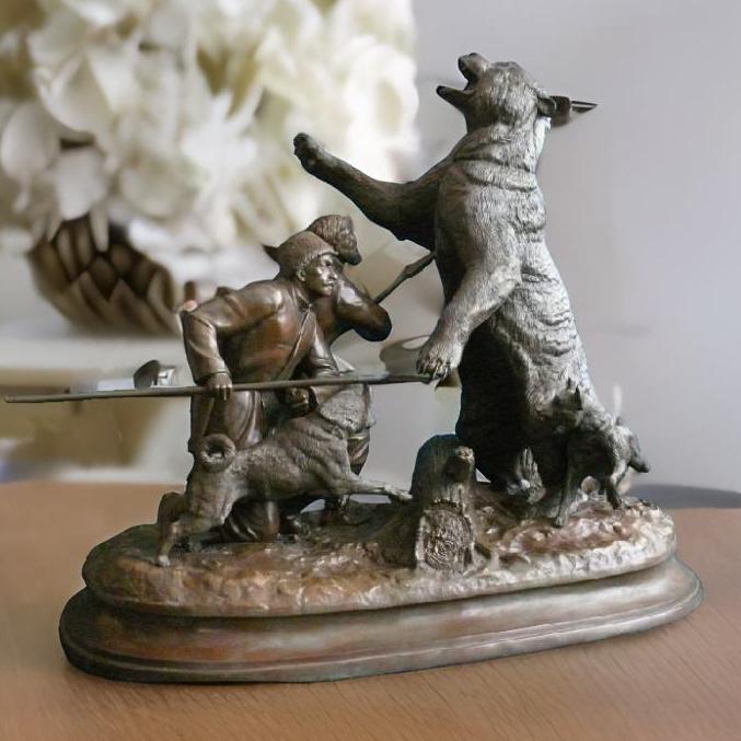 Эта захватывающая бронзовая композиция изображает двух охотников в схватке с медведем, помогают им собаки. Динамичное и выразительное изображение охоты, станет ярким элементом вашего интерьера. Такой подарок может стать символом мужества и смелости, а также подарить вдохновение ценителям искусства и охотникам. |