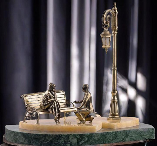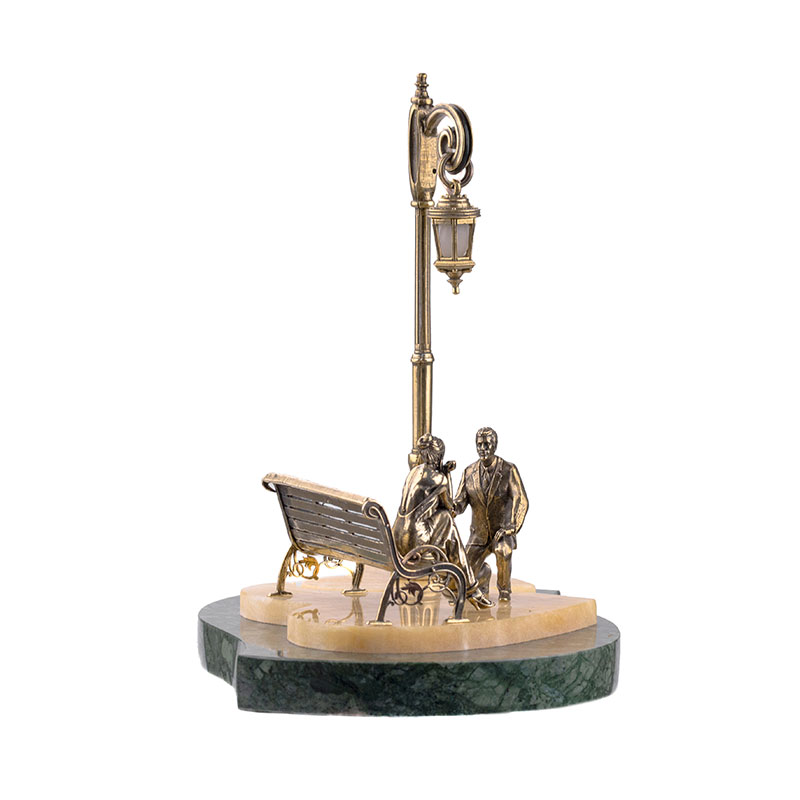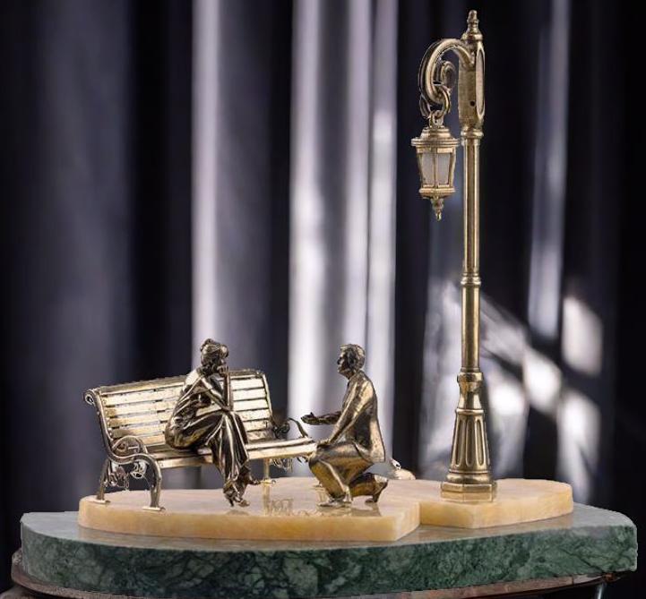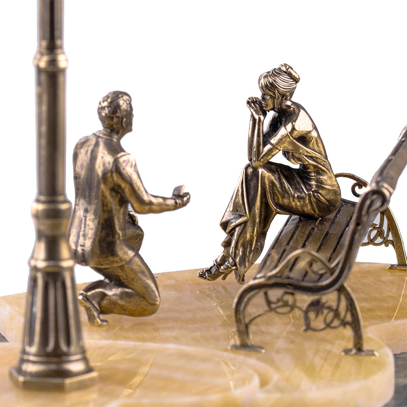 Непревзойденное произведение искусства, символизирующее самый трепетный и романтичный момент в отношениях — бронзовая композиция Предложение. Это великолепное изделие из изысканного материала оживляет сцену, в которой мужчина делает предложение руки и сердца своей любимой на скамейке у фонарного столба. Чувства и эмоции застывают в бронзе, открывая практически бесконечные возможности для вдохновения и размышлений. Это идеальный подарок для любителей изысканного искусства, коллекционеров и тех, кто ценит вечную красоту и элегантность. Чарующая бронзовая композиция Предложение станет прекрасным украшением интерьера любого помещения и незабываемым подарком на юбилей или годовщину свадьбы. Почувствуйте историю, замершую в бронзе! |