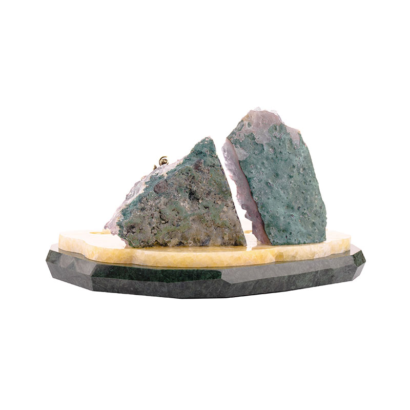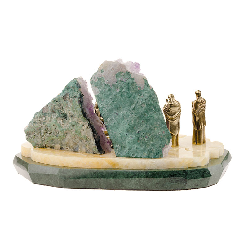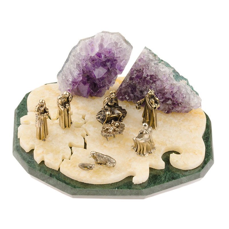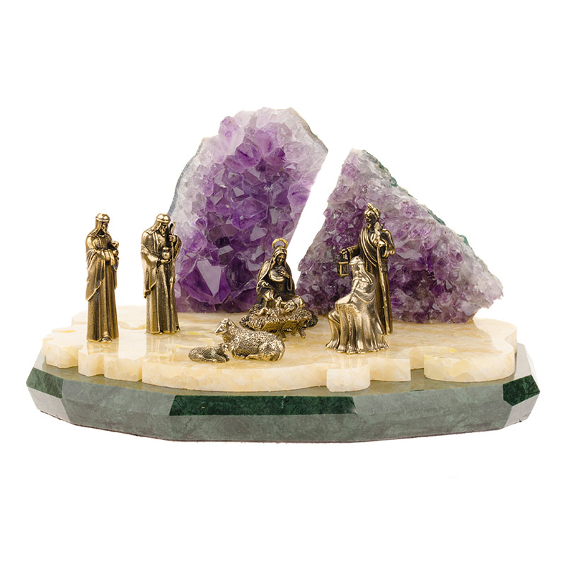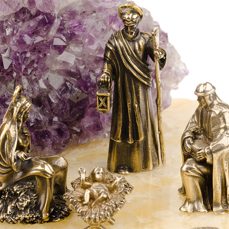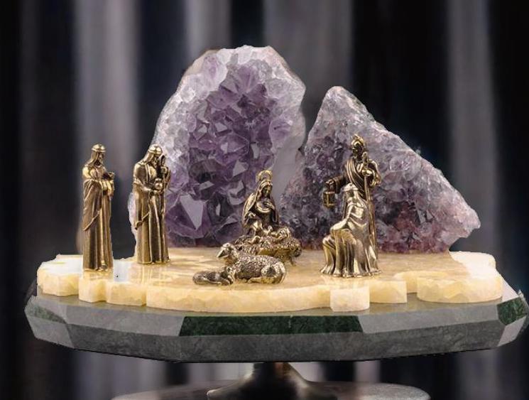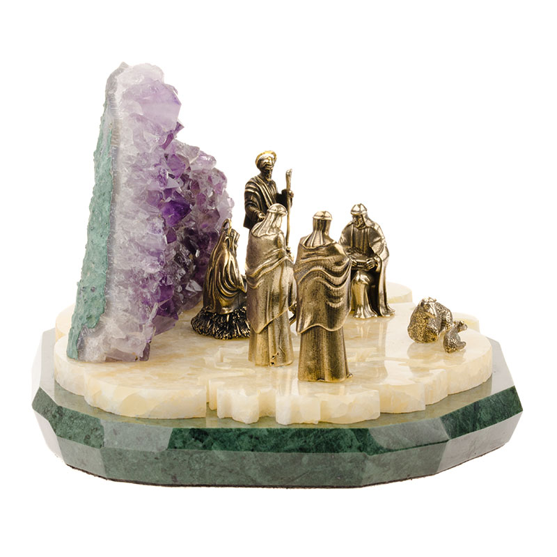 Подарочная композиция, инсценирующая момент рождения Иисуса Христа в Гроте Рождества. В композиции представлены бронзовые статуэтки младенца-Иисуса, Девы Марии, волхвов, принёсших божественные дары - золото, ладан и мирру. Пещера имитирована друзами аметистов, мягко переливающимися под светом плавно мерцающей подсветки, расположенной под яслями Иисуса и под кристаллами цитрина. |