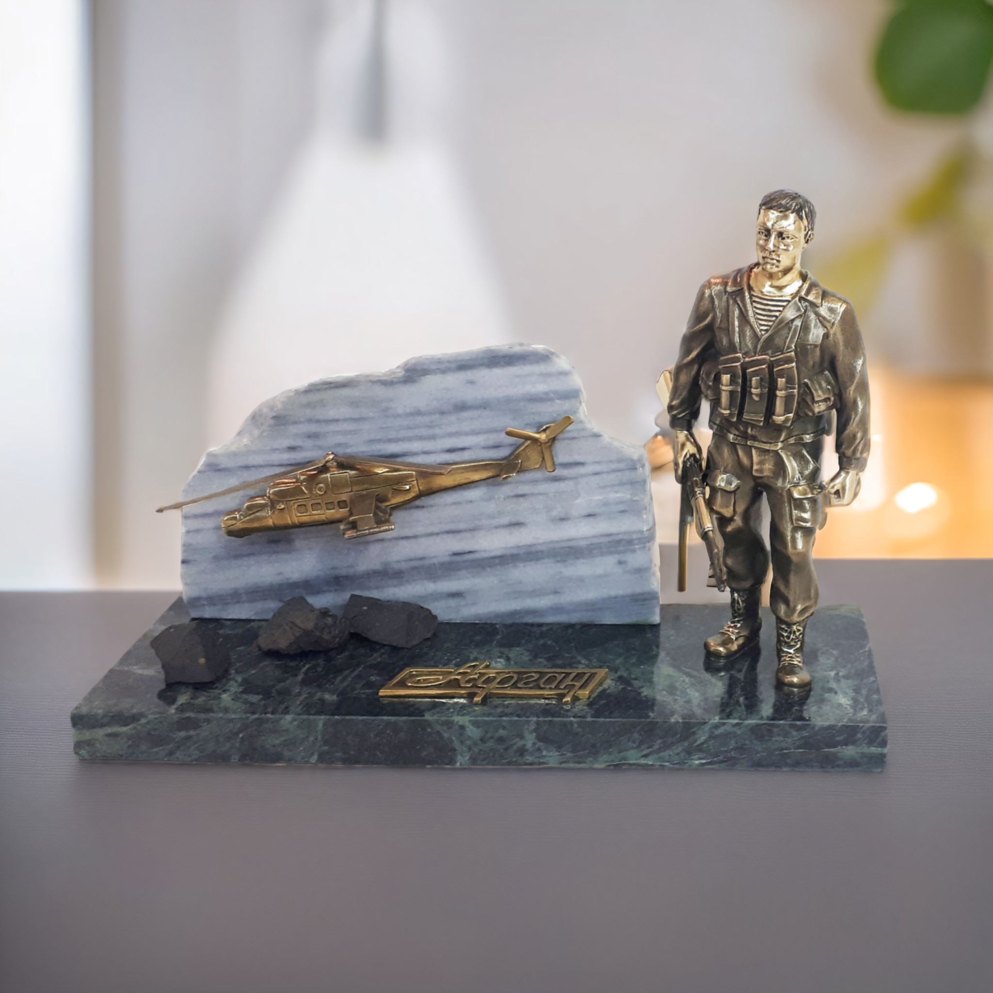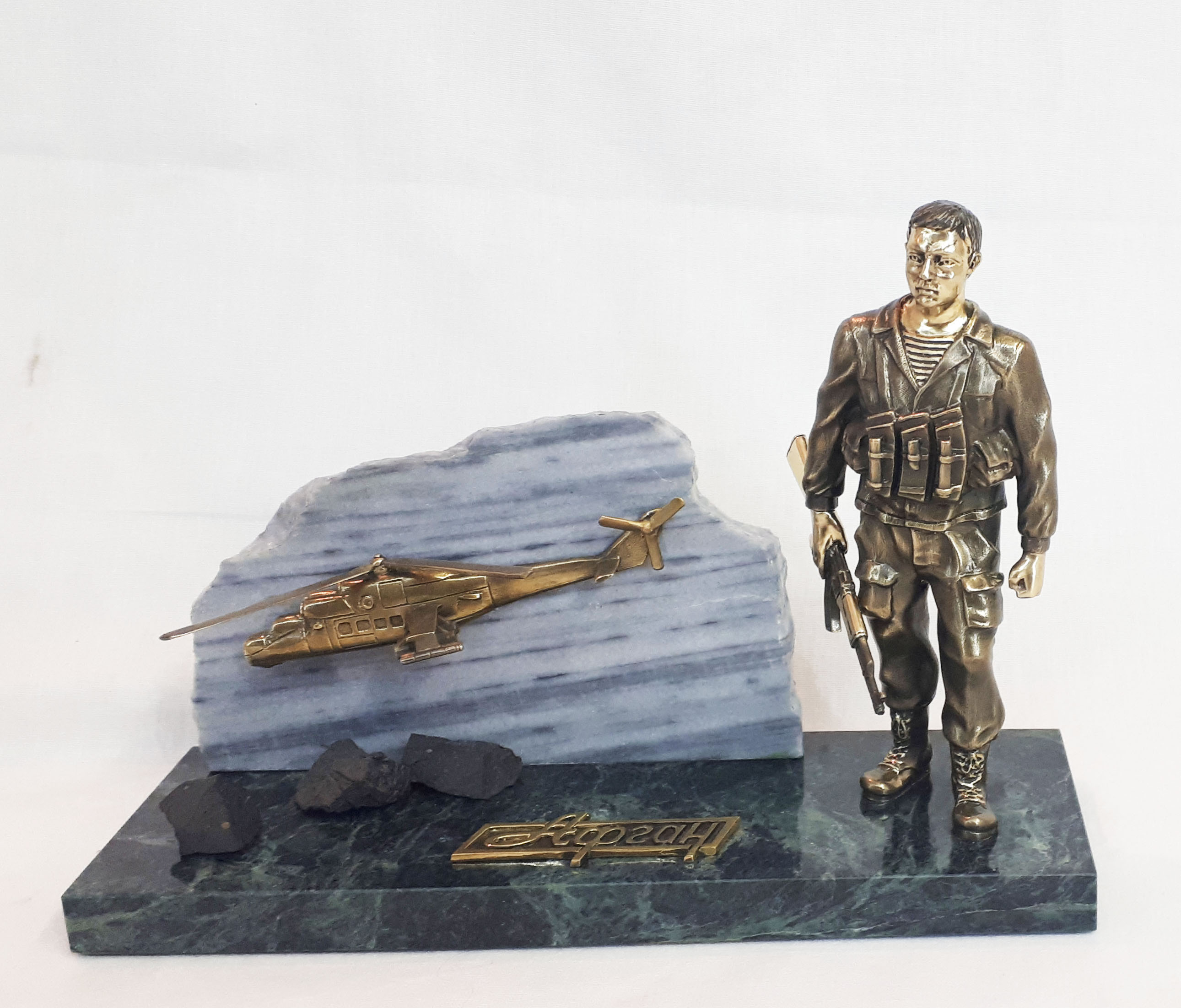 Уважаемые любители истории и неординарного искусства! Рады представить вам уникальный собирательский экземпляр — бронзовую статуэтку Афганский. Это изображение советского бойца на фоне вертолёта, выполненное с неповторимым мастерством. Скульптура изящно передает трагическую и героическую атмосферу того времени, ее подлинность подчеркнута глубиной деталей и выразительности каждого элемента.