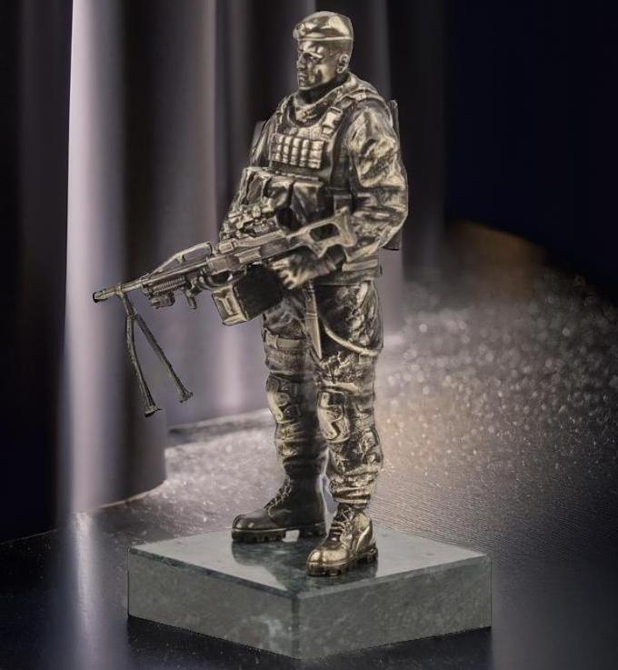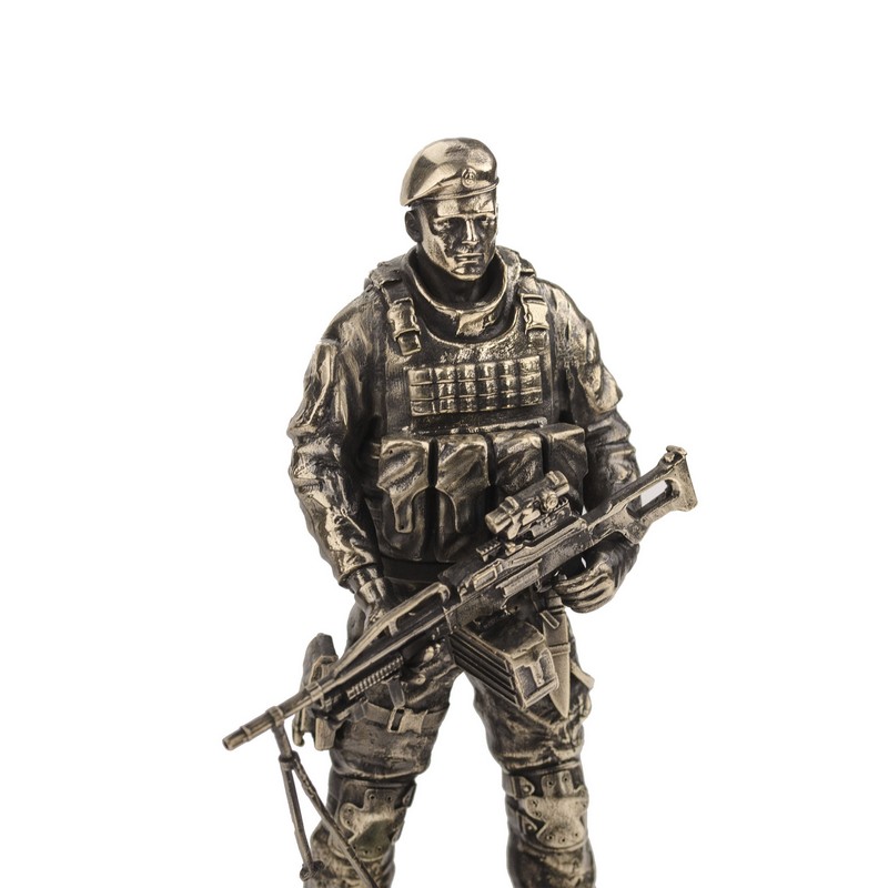 Коллекционная статуэтка в виде российского десантника в полном обмундировании, в отличительном берете, с 7,62-мм пулеметом "Печенег" - модернизированной версией единого пулемета Калашникова. Статуэтка представляет собой бойца в полной боевой готовности с сосредоточенным выражением лица, словно готового вскинуть оружие и отразить угрозу. Невероятно реалистичная статуэтка станет ценным экспонатом в коллекции военных миниатюр и послужит роскошным подарком увлеченному коллекционеру. |