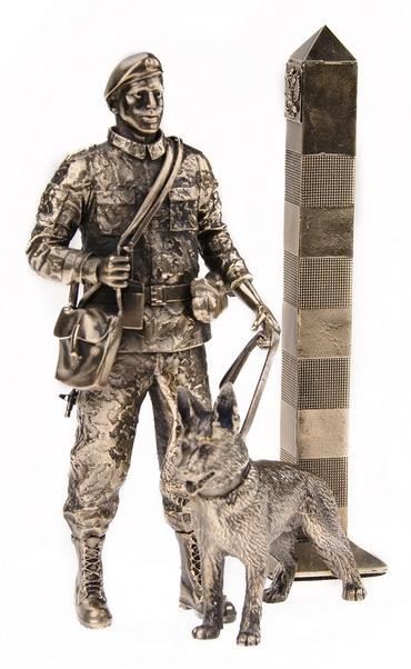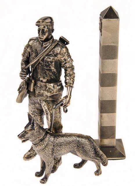 Коллекционная статуэтка солдата пограничных войск в полном обмундировании, с оружием, в отличительном берете, с верным псом, вместе с которым он несет свой дозор у границы страны. Рядом с солдатом расположен пограничный столб с гербом РФ - своеобразный символ пограничной службы. Пограничные войска - щит нашей Родины, а статуэтка полностью отражает смысл этого понятия - выражение лица солдата сосредоточенное, вдумчивое и готовое отразить проникновение нежелательного гостя на границе. |