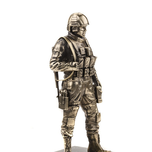 Коллекционная статуэтка в виде солдата Сил Специальных Операций в полной экипировке, согласно последнему принятому обмундированию Минобороны Рф. Помимо современных средств защиты, которые можно рассмотреть на статуэтке, солдат имеет на вооружении автомат Калашникова последней модификации с планками Пикатинни с возможностью установки лазерных целеуказателей. На шлеме солдата установлены наушники со встроенной радиостанцией для связи с бойцами подразделения. |