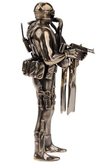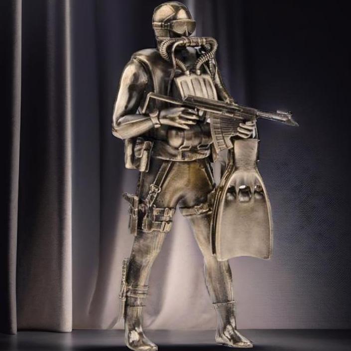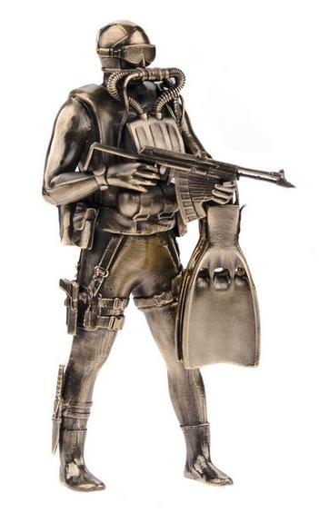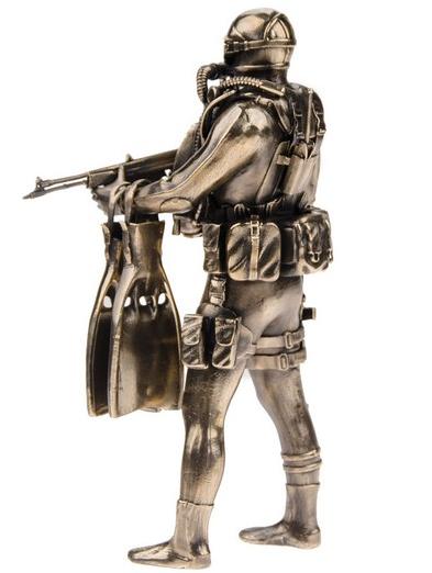 Коллекционная статуэтка водолаза в гидрокостюме с водолазным снаряжением, в маске, с ластами в руках и гарпуном наготове. Примечательно, что профессия водолаза в России приравнивается к особо вредным и сопряженным с риском для жизни. Профессия водолаза предполагает широкую область применения - от исследовательских работ на различных глубинах до поисково-спасательных операций. |