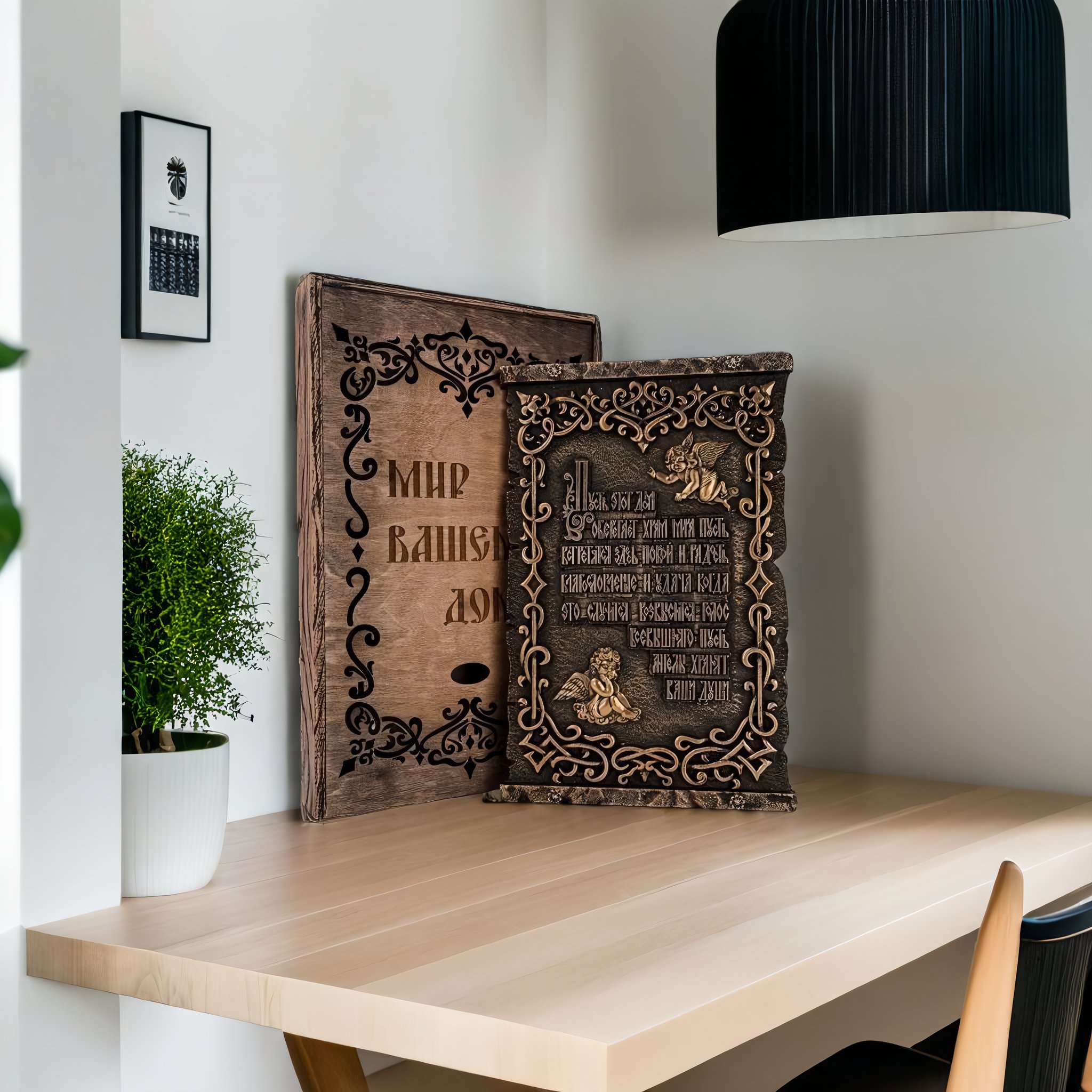 Табличка в виде развернутого свитка с изображением ангелов и молитвой-обращением с добрым и сердечным пожеланием мира и добра дому, в котором живут дорогие люди. Табличка представлена в красивой резной коробке с надписью "МИР ВАШЕМУ ДОМУ", что вместе послужит прекрасным подарком практически на любое торжество и точно не оставит никого равнодушным, а табличка в доме всегда с теплом будет напоминать о дарителе. Уникальная авторская работа выполнена из патинированной бронзы. |