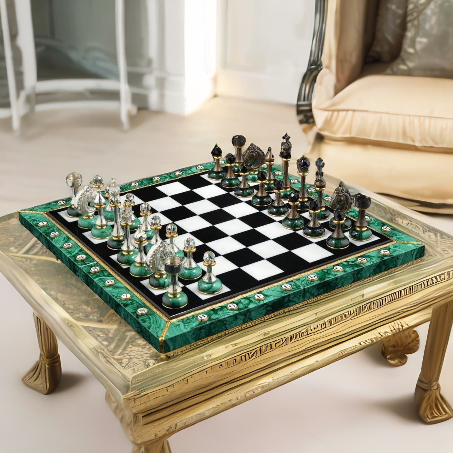 Этот эксклюзивный набор шахмат представляет собой настоящее произведение искусства, объединяющее в себе блеск позолоченной латуни, холодную красоту мрамора и таинственные оттенки долерита и малахита. Доска выполнена с утонченным вкусом и мастерством, используя материалы высшего качества: каждая ячейка - это сочетание блеска позолоченной латуни и неповторимых рисунков мрамора, долерита и малахита. Фигуры же представляют собой малахит, при этом каждая из них уникальна благодаря неповторимому узору камня. Тело фигуры- позолоченная и посеребренная бронза, что добавляет им особого шарма и блеска. Такой роскошный набор шахмат станет звездой любой коллекции и подарит незабываемые моменты каждой партии. Идеален для подарка коллекционерам, любителям роскоши и качественных вещей. |