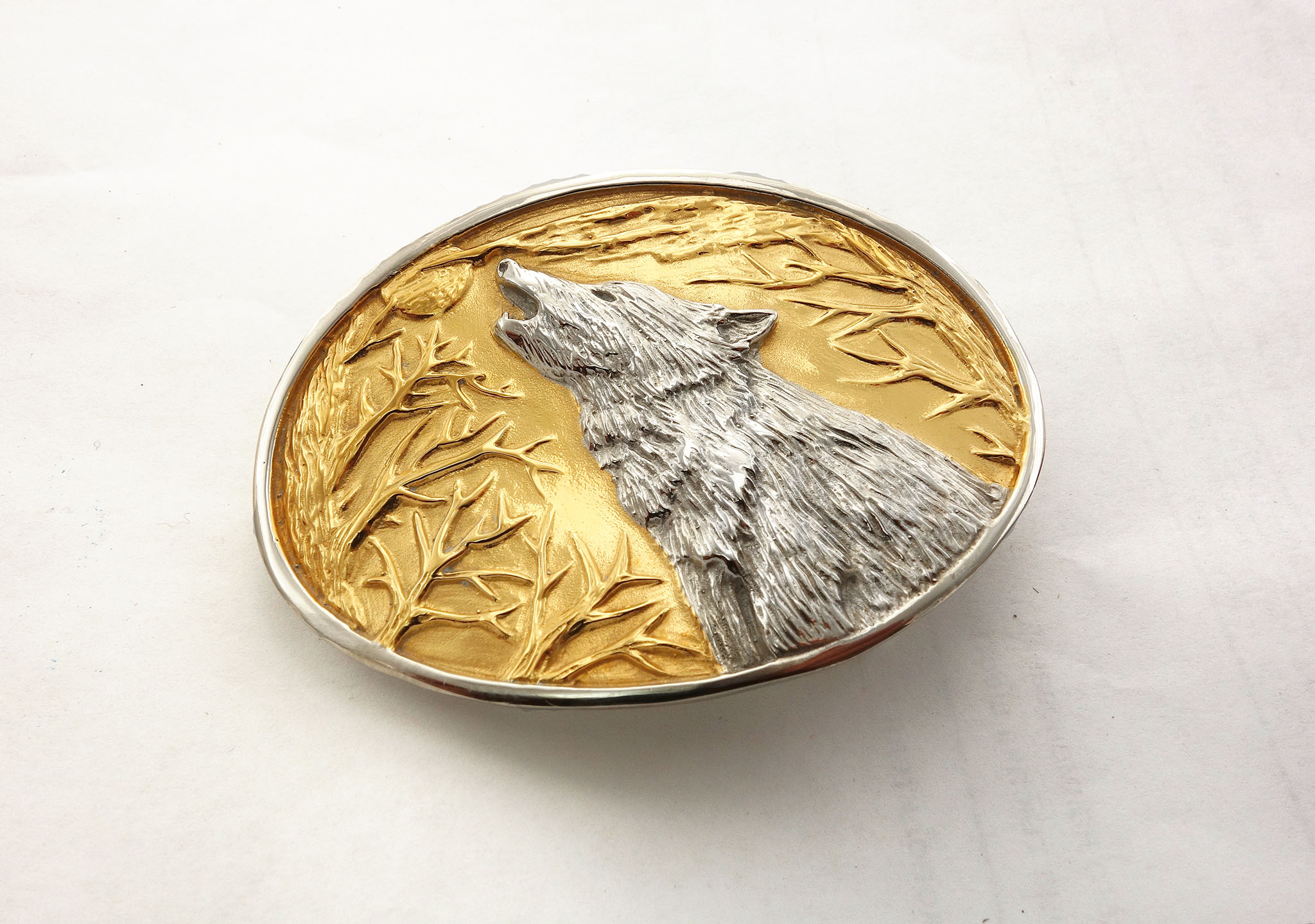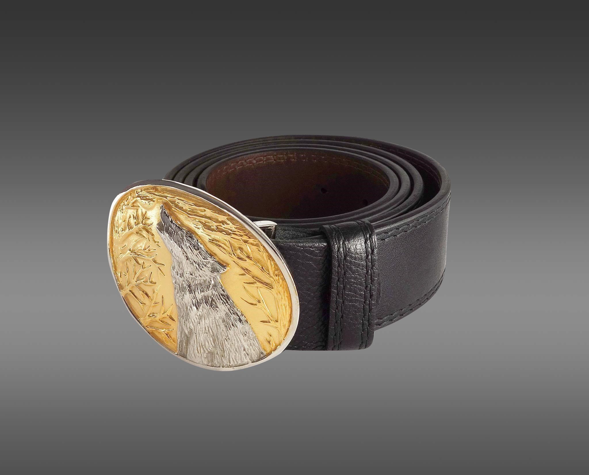 Пряжка ремня выкована из бронзы с золочением, что придает ей изысканный и роскошный вид. Дизайн пряжки в форме волка демонстрирует силу и уверенность владельца ремня. |