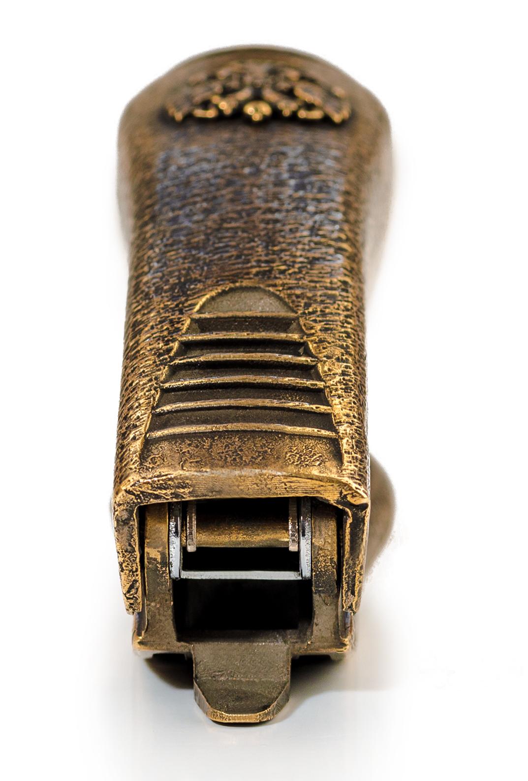 Степлер, выполненный из патинированной бронзы, с накладкой в виде герба РФ (по Вашему желанию можно сделать другую накладку). Бронзовый степлер не просто необходимая канцелярская принадлежность, но и статусный подарок с наилучшими пожеланиями коллеге или руководителю. Примечательно, что первый известный сшиватель был ручной работы. Изготовлен в XVIII столетии во Франции для короля Людовика XV. Каждая скоба была помечена знаком отличия королевского двора. |