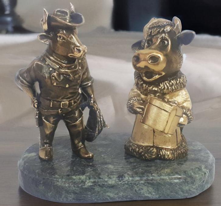 Встречайте Новый 2021 год вместе с замечательным сувениром – бронзовой фигуркой «Бык и корова». Они украшены яркой новогодней одеждой и держат в своих копытах подарки. Символ года, выполненный из бронзы, станет отличным подарком и украшением для Вашего дома или офиса. Подарите себе и своим близким радость, ощутите праздничное новогоднее настроение с нашими бронзовыми статуэтками! Ощутите дух новогоднего чуда и сказки с нашим бронзовым сувениром «Новогодний. 2021 год»! |