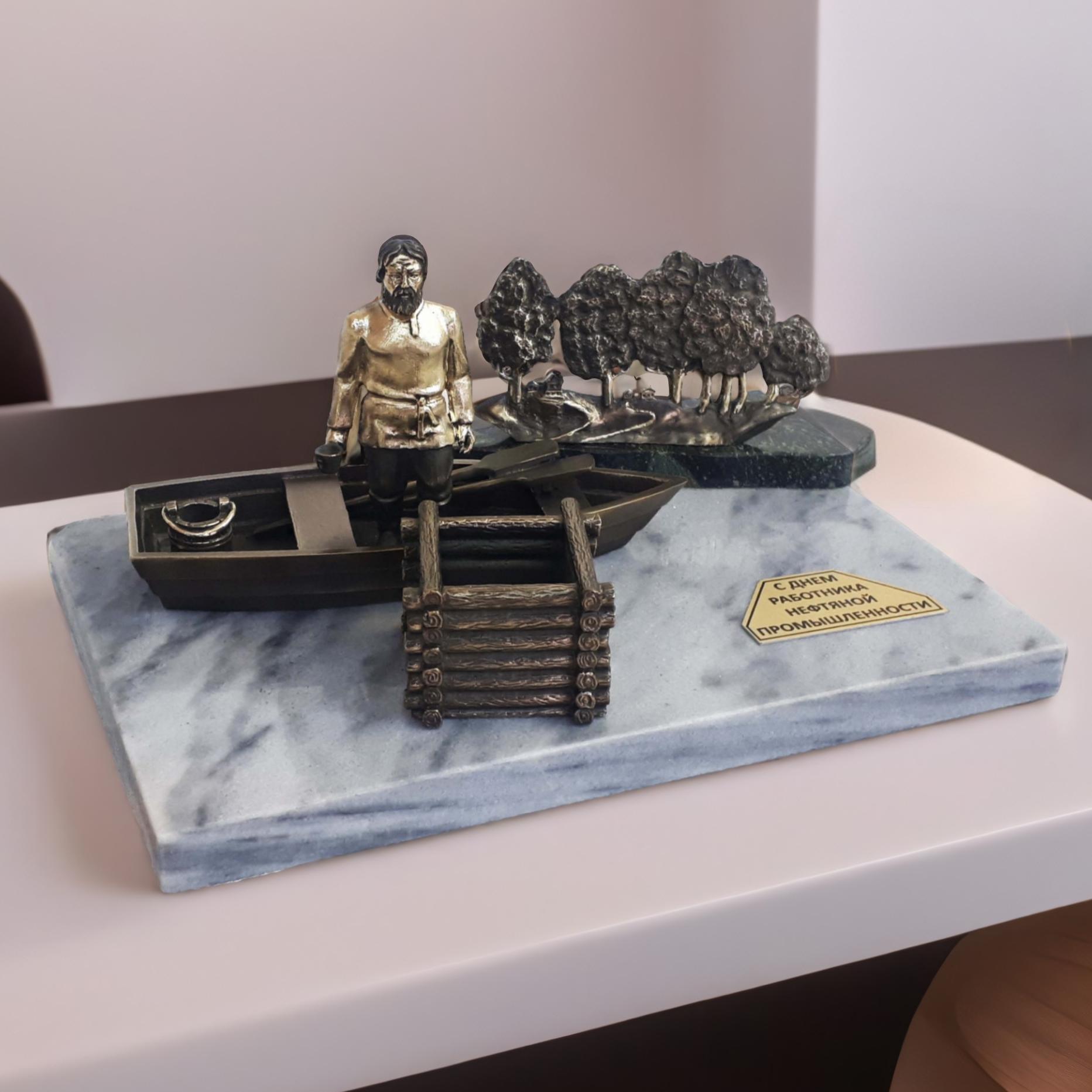Уникальное предложение для любителей истории и коллекционеров! Представляем вашему вниманию бронзовый сувенир, иллюстрирующий важнейшую веху в истории России — Первый нефтяной промысел. Изображение человека, занимающегося добычей нефти, выполнено в бронзе и установлено на постаменте из качественного мрамора.