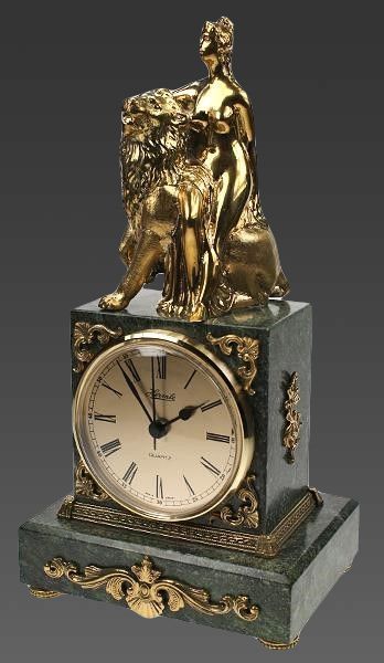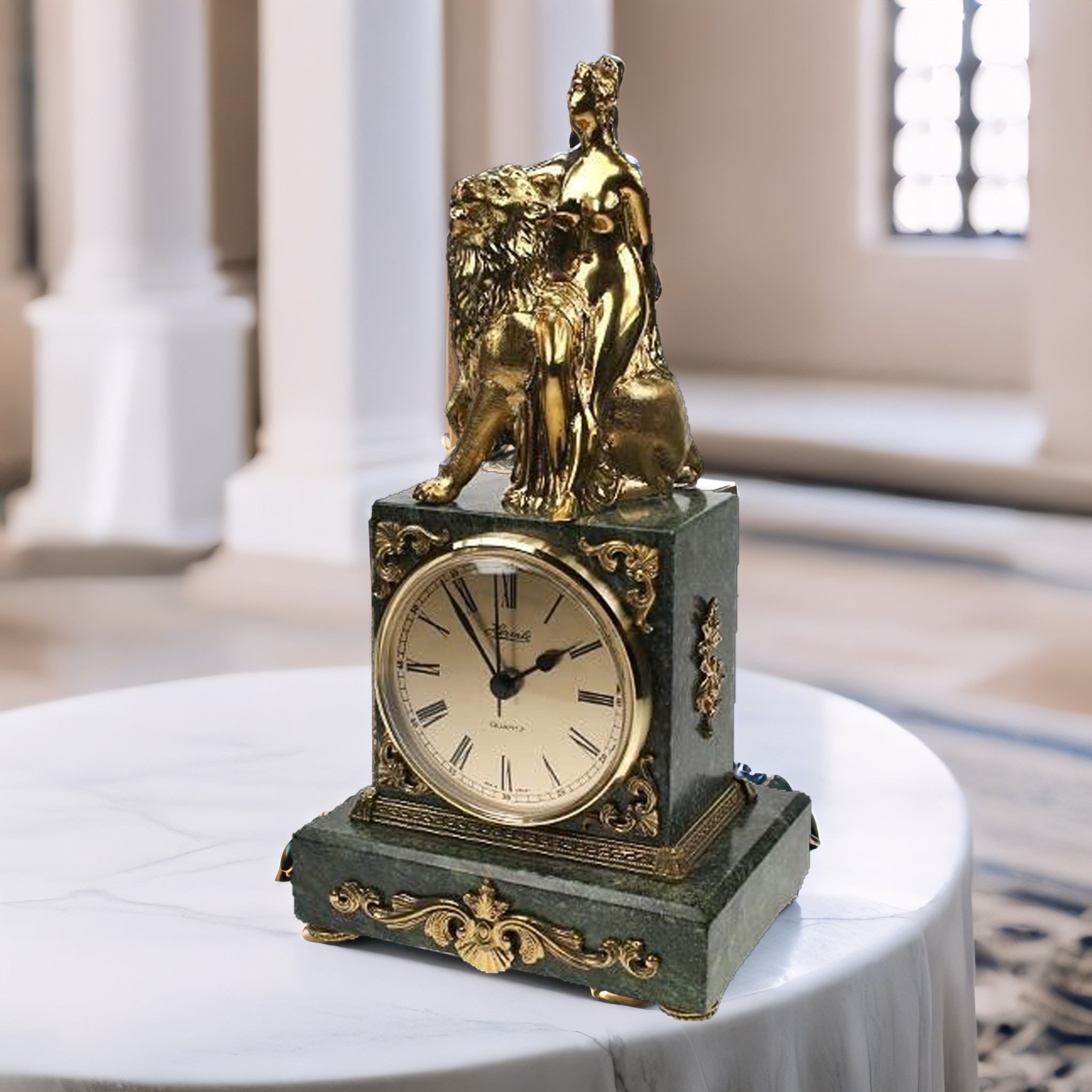 Позвольте себе немного роскоши с нашими эксклюзивными настольными часами Диана со львом из бронзы на часах из змеевика.