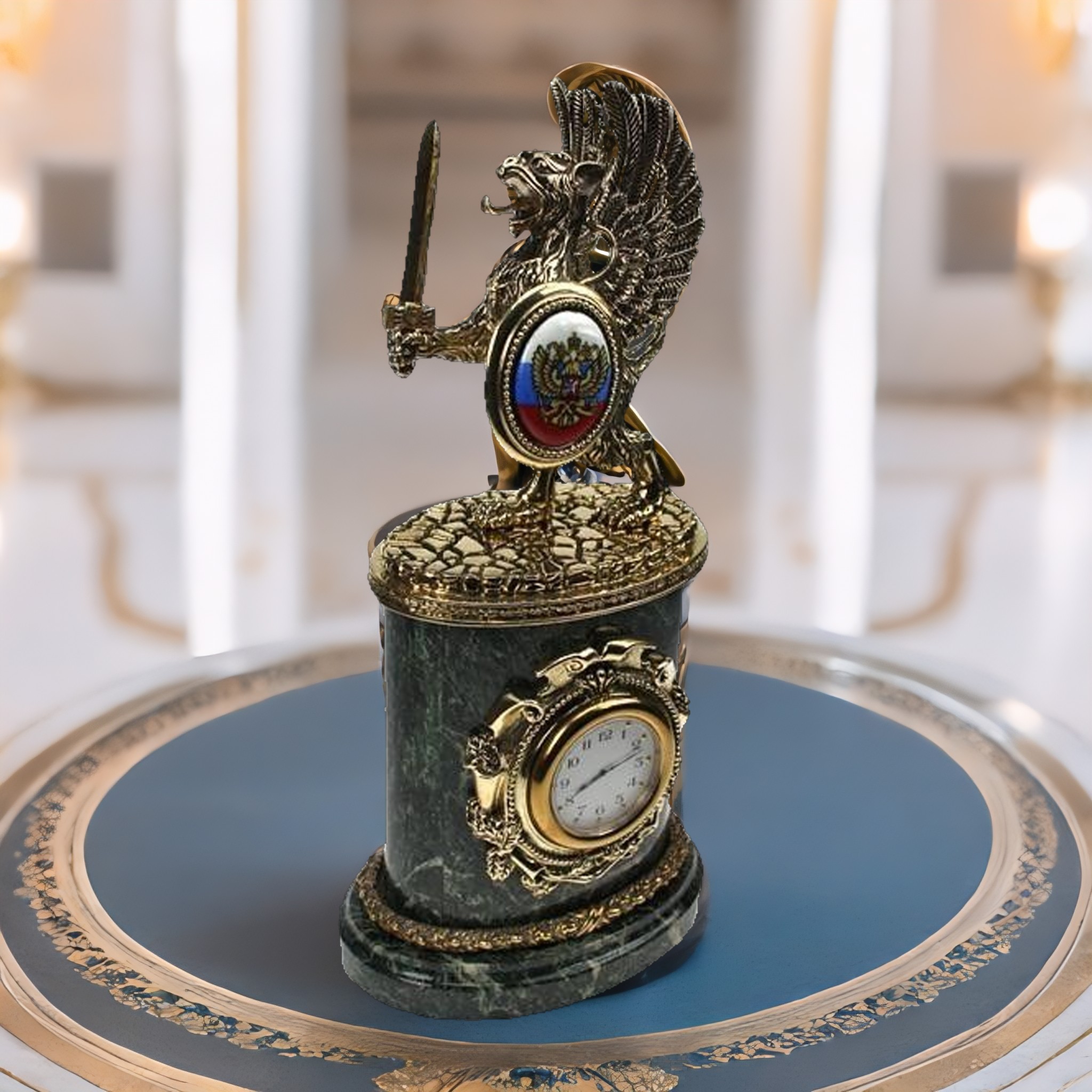 Вы в поисках уникального подарка или ищете нечто особенное, чтобы добавить шарм вашему интерьеру? Мы предлагаем вам не просто часы, а настоящее произведение искусства — настольные часы, украшенные фигурой грифона, выполненной из бронзы. Он символизирует мужество и бдительность, делая этот аксессуар не только красивым, но и многослойным в своем значении.