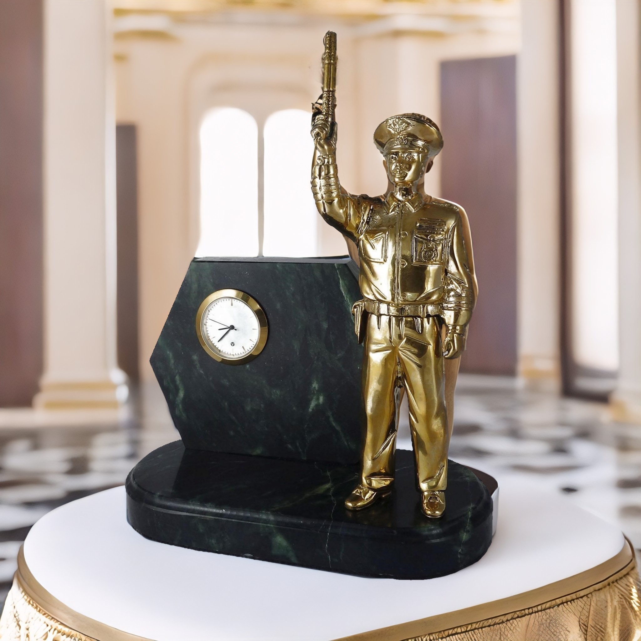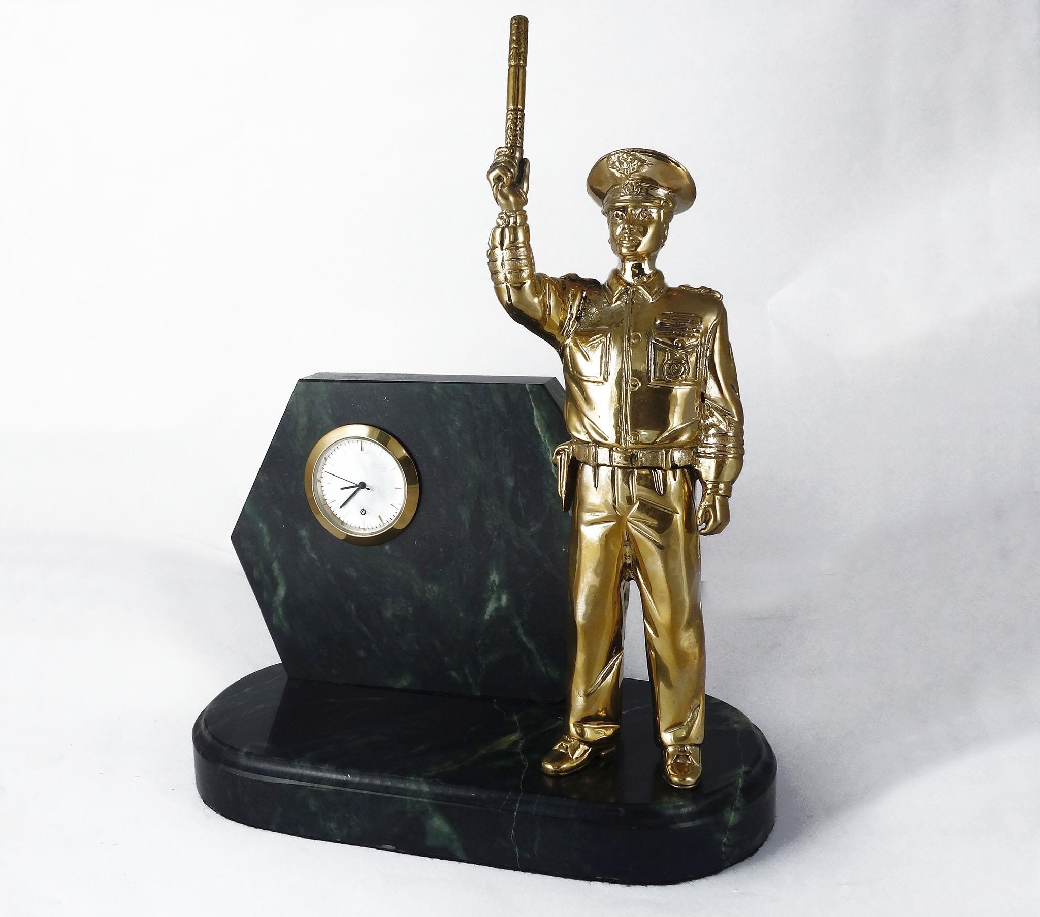 Элегантность, качество, стиль. Все это и многое другое представляют собой наши Часы подарочные настольные со скульптурой Инспектора ГИБДД, выполненные из благородной бронзы и установленные на роскошной основе из змеевика. Независимо от того, кто вы и что у вас за работа, эти часы подчеркнут вашу уникальность, поднимут настроение и оставят незабываемое впечатление у каждого, кто увидит их на вашем письменном столе.