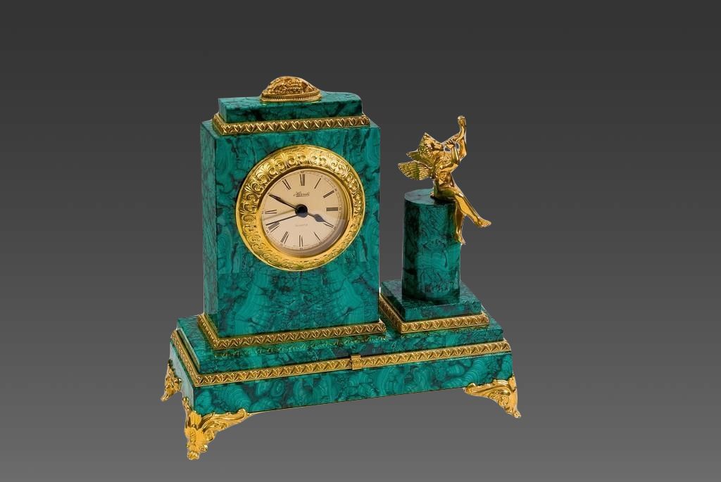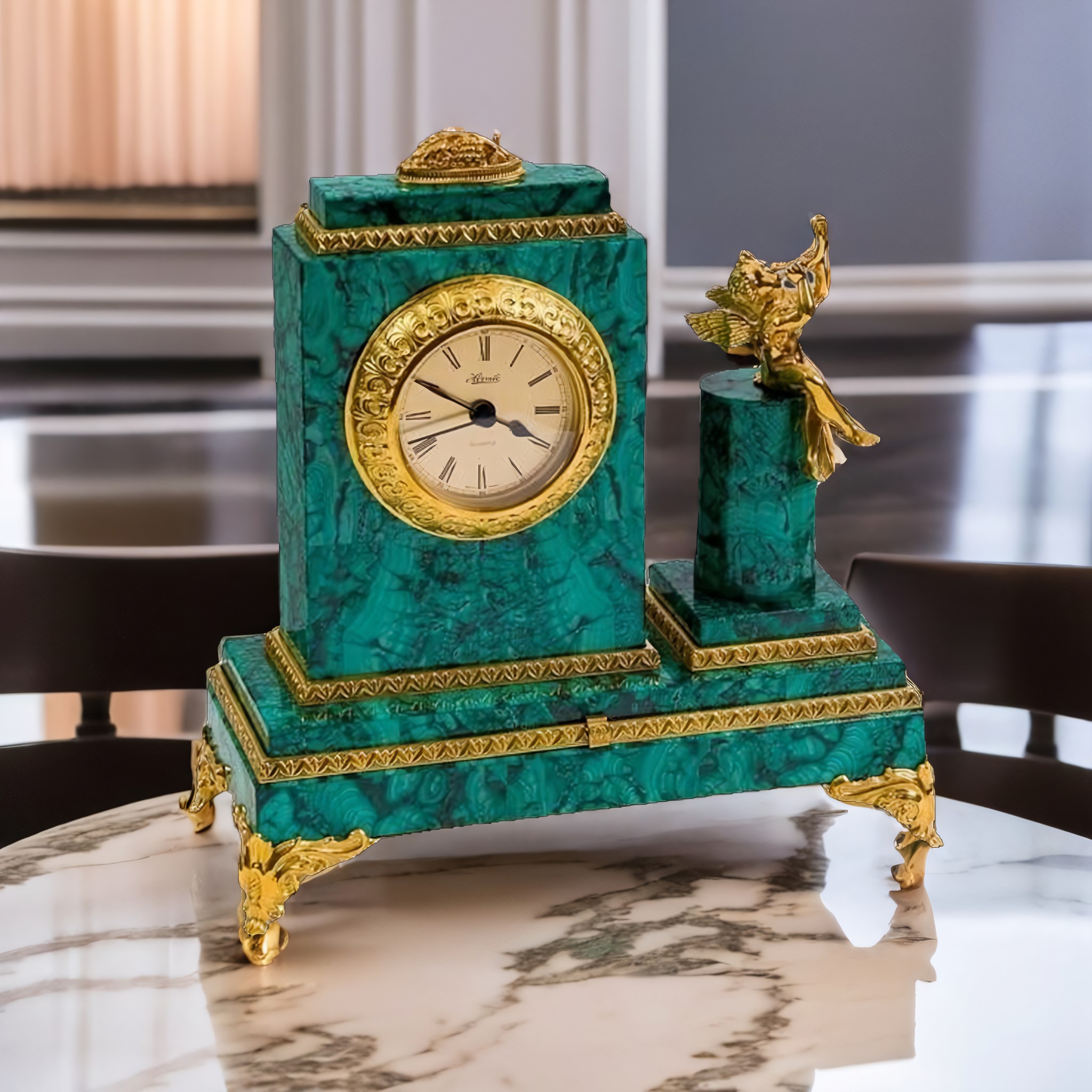 Вас привлекают объекты искусства, которые одновременно служат и практической цели? Оцените наши часы из малахита Ангелочек, украшенные бронзовой статуэткой ангела. Эта утонченная модель выполнена из натурального малахита – камня, который с давних времен считается символом красоты и богатства. Малахитовые часы – это не просто предмет интерьера, а настоящий оберег для вашего дома. Эффектное дополнение – бронзовая статуэтка ангела на циферблате. Она придаёт часам особенную изысканность и шарм, создавая тёплую, защищённую атмосферу вокруг себя.