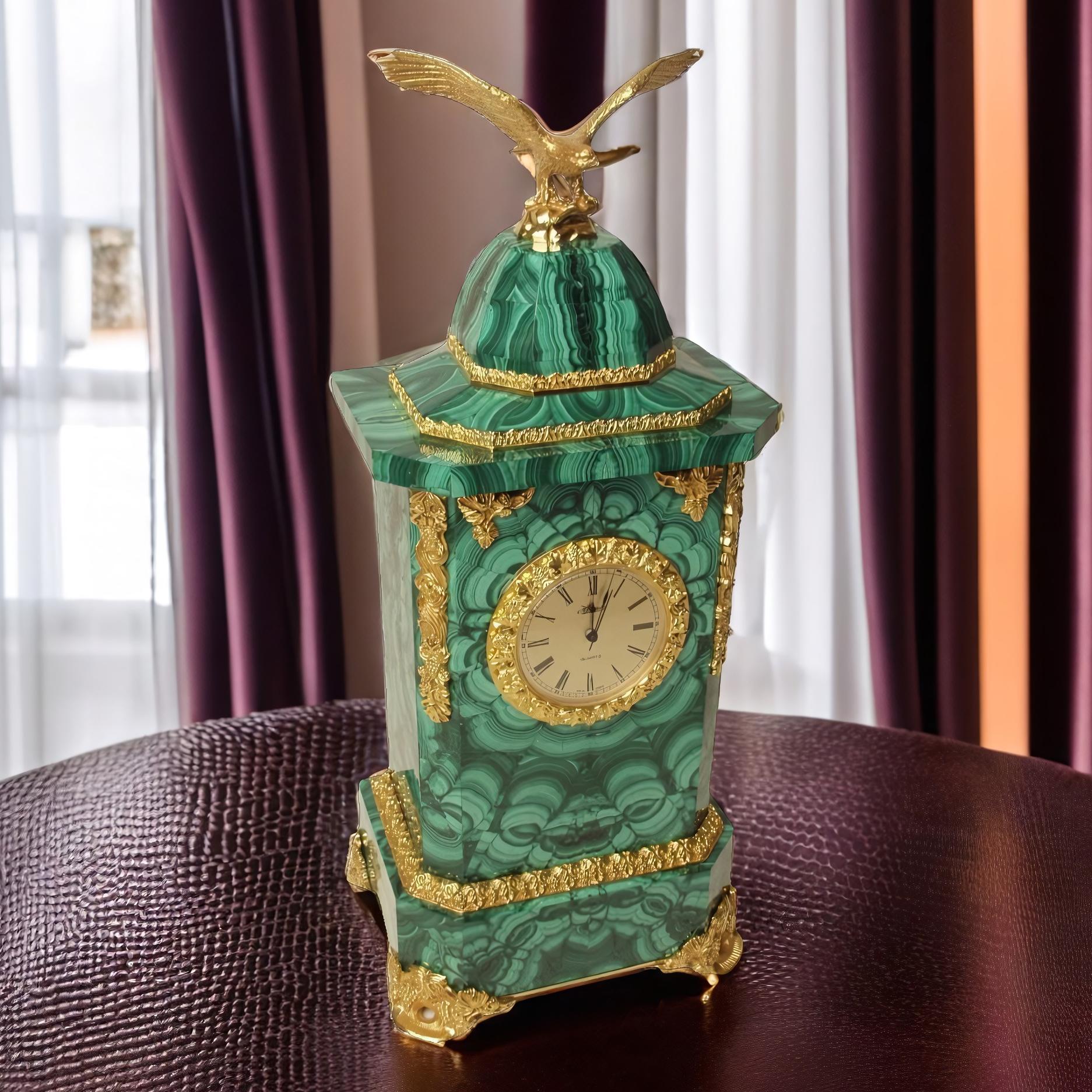 Подчеркните вашу индивидуальность с шикарными часами из малахита с бронзой Орел. Это не просто устройство, показывающее время, это жемчужина вашего интерьера, отражающая ваш изысканный вкус. Сочетание малахита и бронзы придает этому произведению искусства уникальную глубину и текстуру, благодаря которой каждый экземпляр уникален. Элементы из позолоченной бронзы добавляют часам роскошный блеск и глубину цвета.