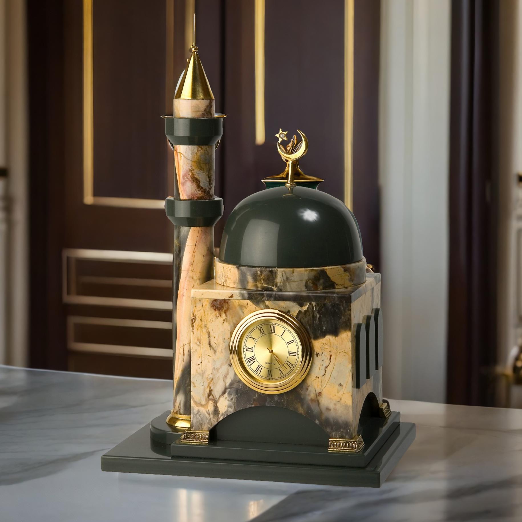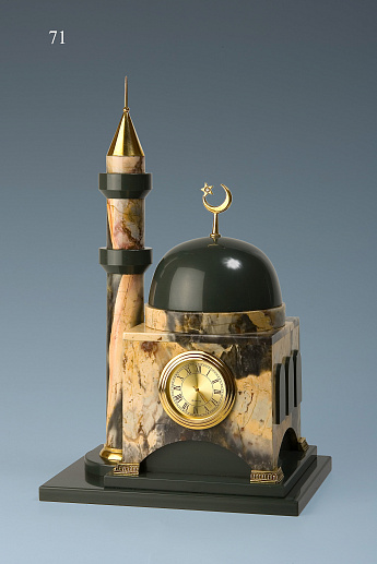 Стиль и элегантность – две основные черты наших уникальных часов из яшмы «Мечеть». Изготовленные в форме прекрасного архитектурного сооружения — Мечети, эти часы являются неповторимым произведением искусства. Добавляют изюминку бронзовые элементы, вносящие в общую композицию часов художественный акцент и подчеркивающие роскошь используемой яшмы.