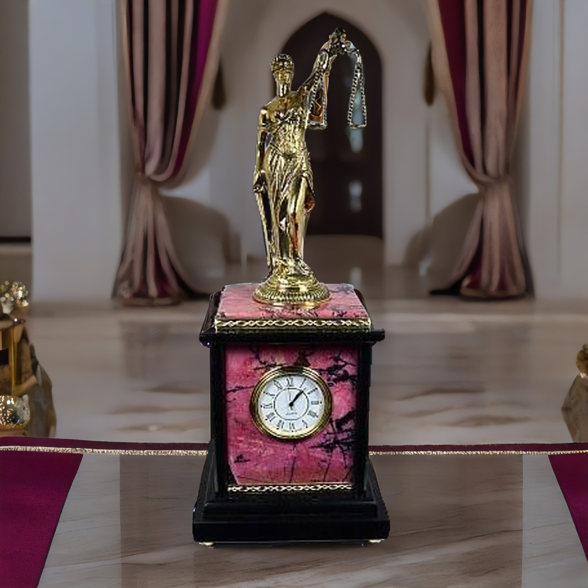 Эксклюзивное предложение для ценителей утонченного стиля и элегантности — часы каминные классические из долерита и родонита. Автор украсил этот произведение искусства статуэткой Фемиды, изготовленной из чистой бронзы. Этот совершенный экземпляр каминных часов станет достойным украшением любого интерьера, подчеркивая статус и великолепный вкус своего владельца. Часы блестят на солнце и излучают тепло в доме благодаря своей сияющей бронзовой отделке.