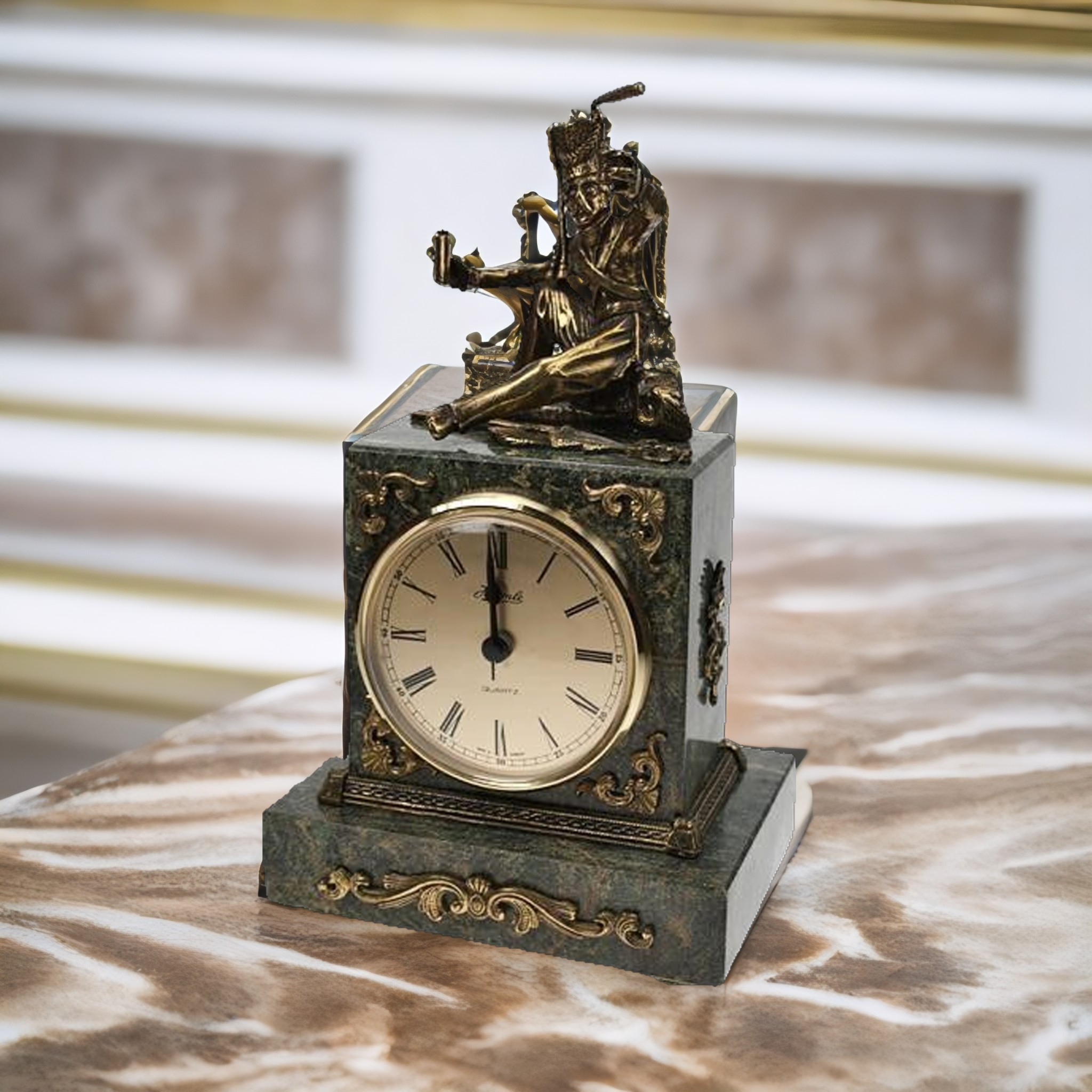 В поисках оригинального подарка? Мы предлагаем Вам настольные часы из змеевика с фигуркой казака, выполненной из бронзы. Наш товар идеально подойдет для любителей неординарных вещей и поклонников славянской культуры. Эти часы — не просто элемент декора, но и символ мужества, отваги, верности традициям. Каждая деталь часов продумана до мелочей и выполнена с любовью к искусству.