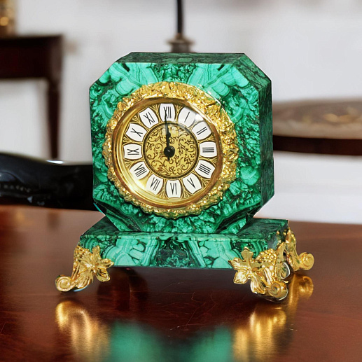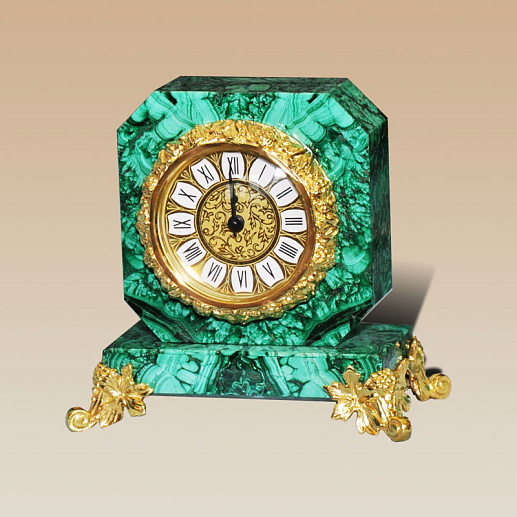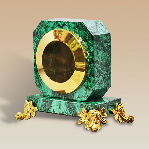 Компактные настольные часы могут стать роскошным подарком на любое торжественное событие. С внешней стороны традиционно расположен циферблат с римскими цифрами, оборотная сторона может быть декорирована памятным изображением, зеркалом или дарственной надписью. Малахитовая поверхность обработана очень тщательно, впечатляя идеальной ровной и гладкой поверхностью, приятной на ощупь.