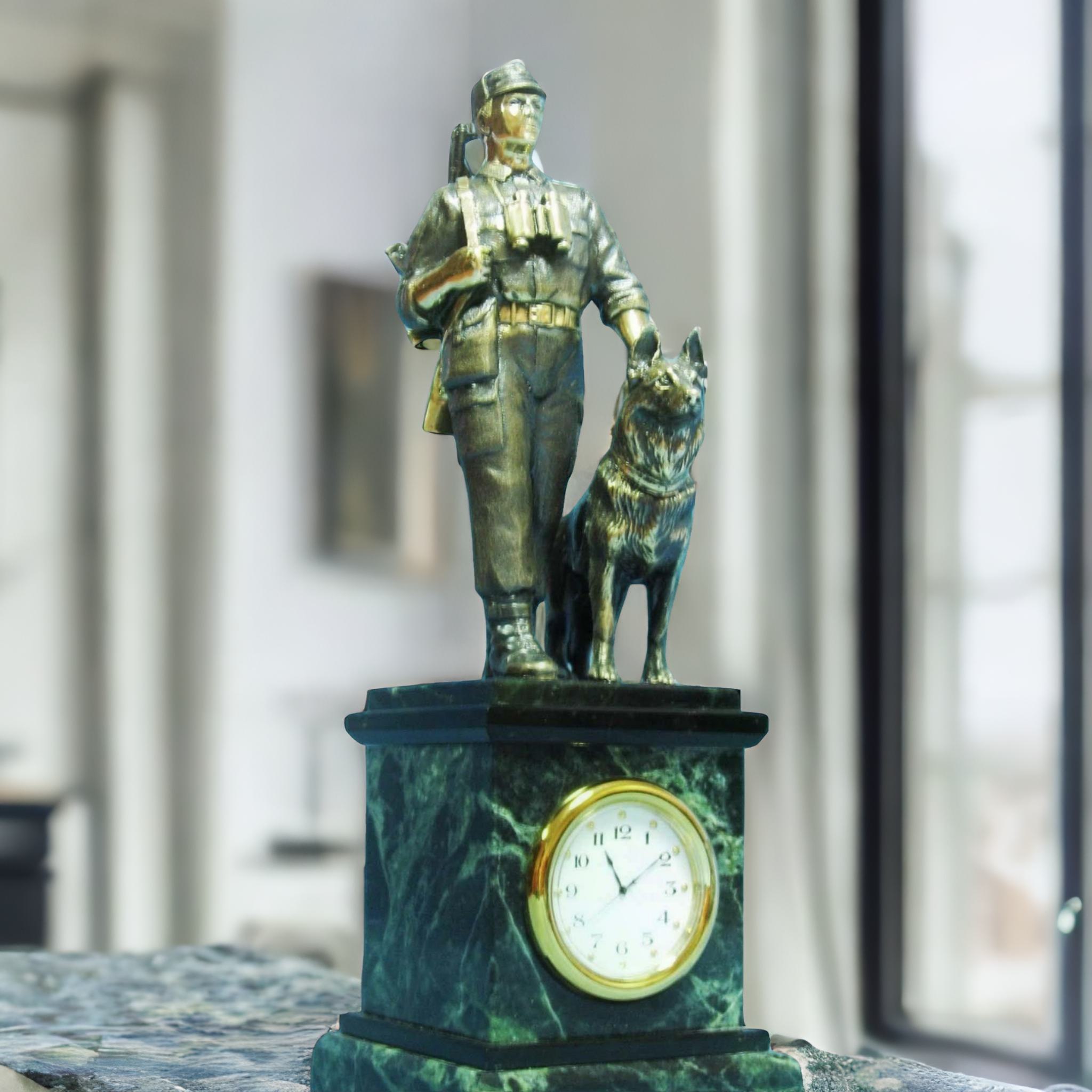 Мы рады представить вам наши винтажные настольные часы — уникальное жемчужину среди настольных аксессуаров. Это не просто часы, но и великолепная ручная работа с вниманием ко всем деталям. Статуэтка пограничника с собакой из бронзы придает им особого шарма и аутентичности. Искусно выполненная форма пограничника и его питомца добавляет к приятному эстетическому восприятию предмета интерьера. Часы из змеевика — это необычное и захватывающее зрелище. Змеевик добавляет чуткости и остроты каждому мгновению, отсчитываемому этими часами. Любители роскоши обязательно оценят эту составляющую нашего товара!