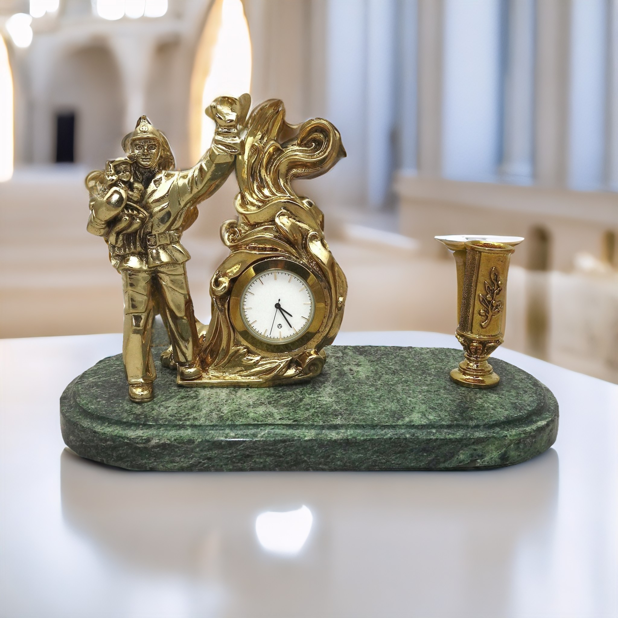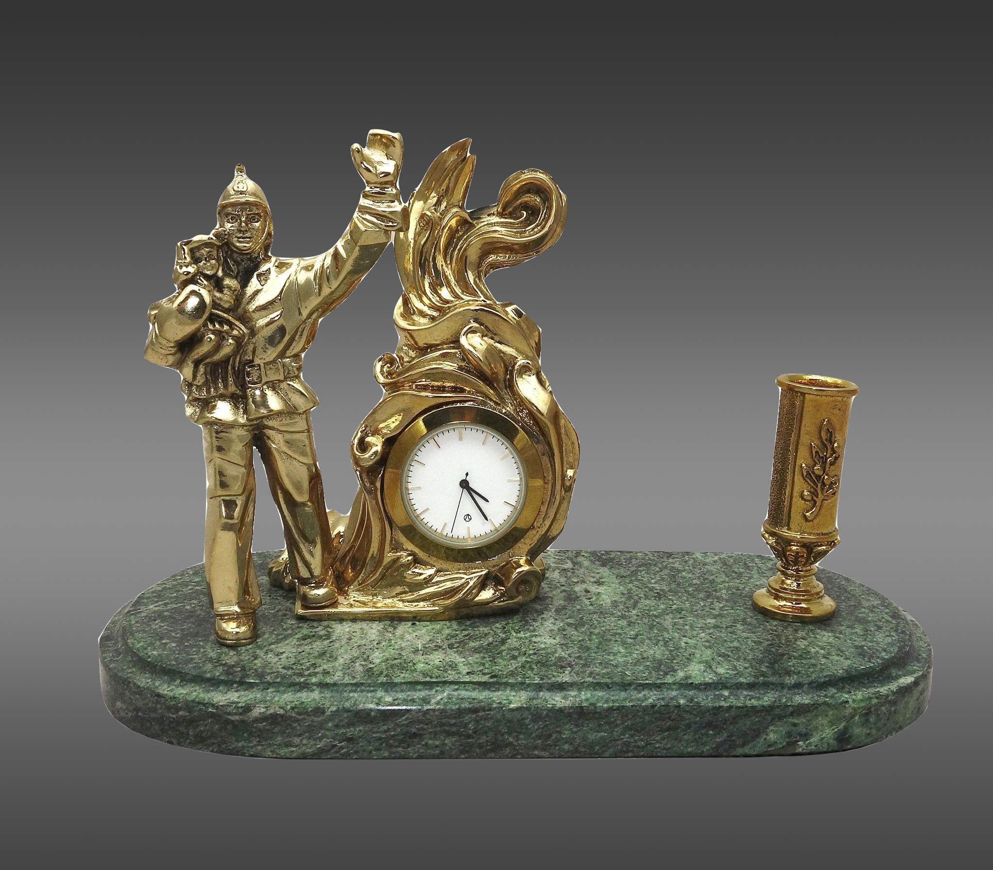 Уникальные часы «Победитель с п/п (Луч)» — идеальный подарок для человека, ценящего изящество и качество. Этот великолепный предмет интеллектуального шика является образцом вневременного ремесла. Часы имеют изображение пожарного, спасающего ребенка — символ отваги и бесстрашия, выполненное из неподражаемой бронзы. Они прикреплены к основанию из благородного змеевика, что добавляет им царского изящества.