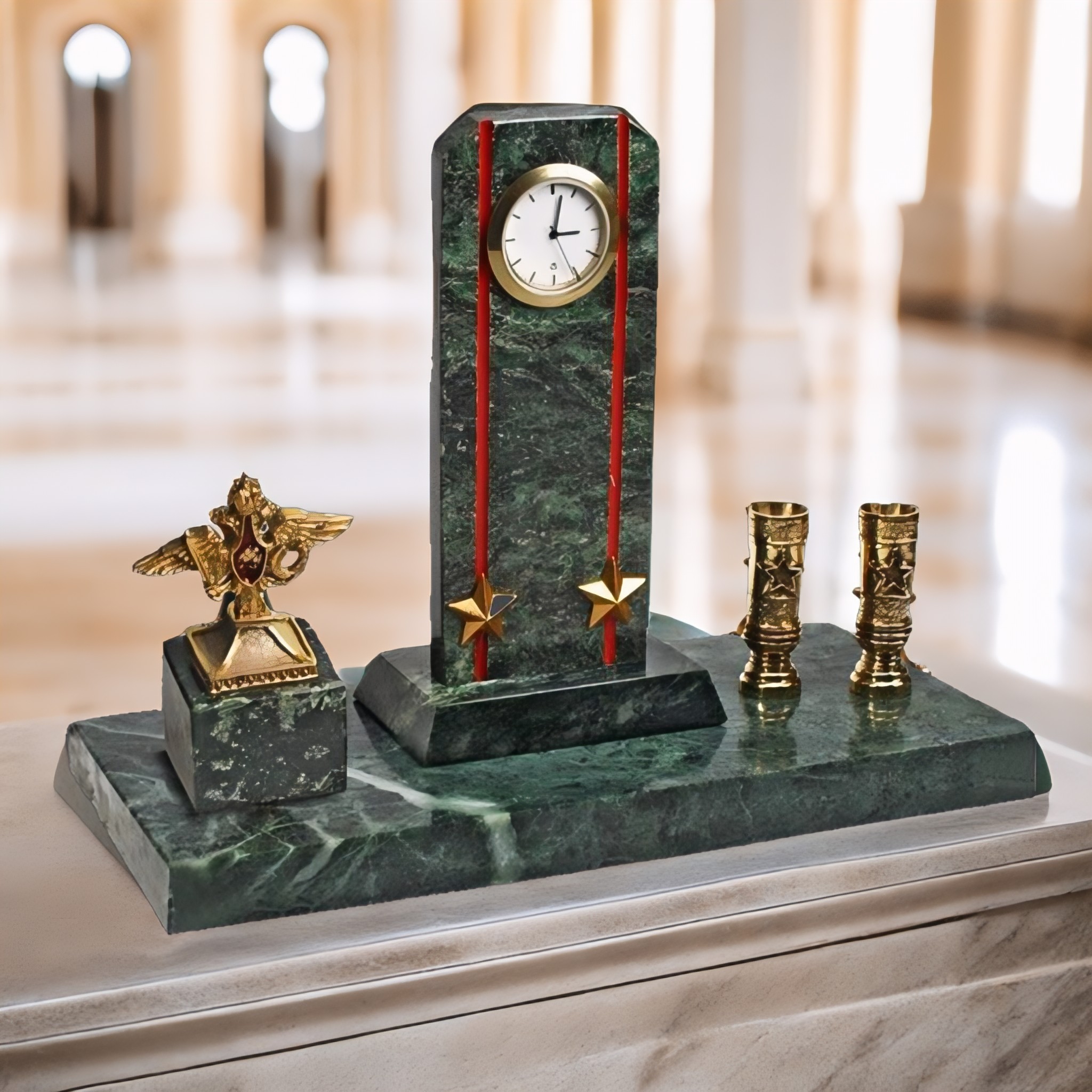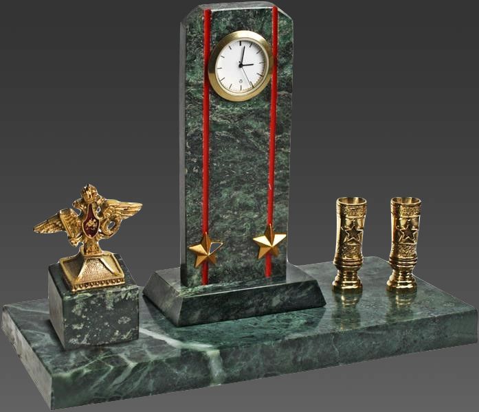 Мы рады представить Вам выдающийся подарок — часы «Погон с п/п и гербом МО»! Созданные из изысканного змеевика, они отражают в себе настоящее искусство ремесленников. Комплектованные 2 подставками для ручек, эти часы играют не только роль украшения интерьера, но и представляют собой функциональный предмет офисного пространства.