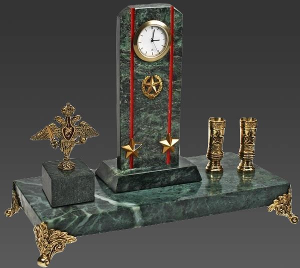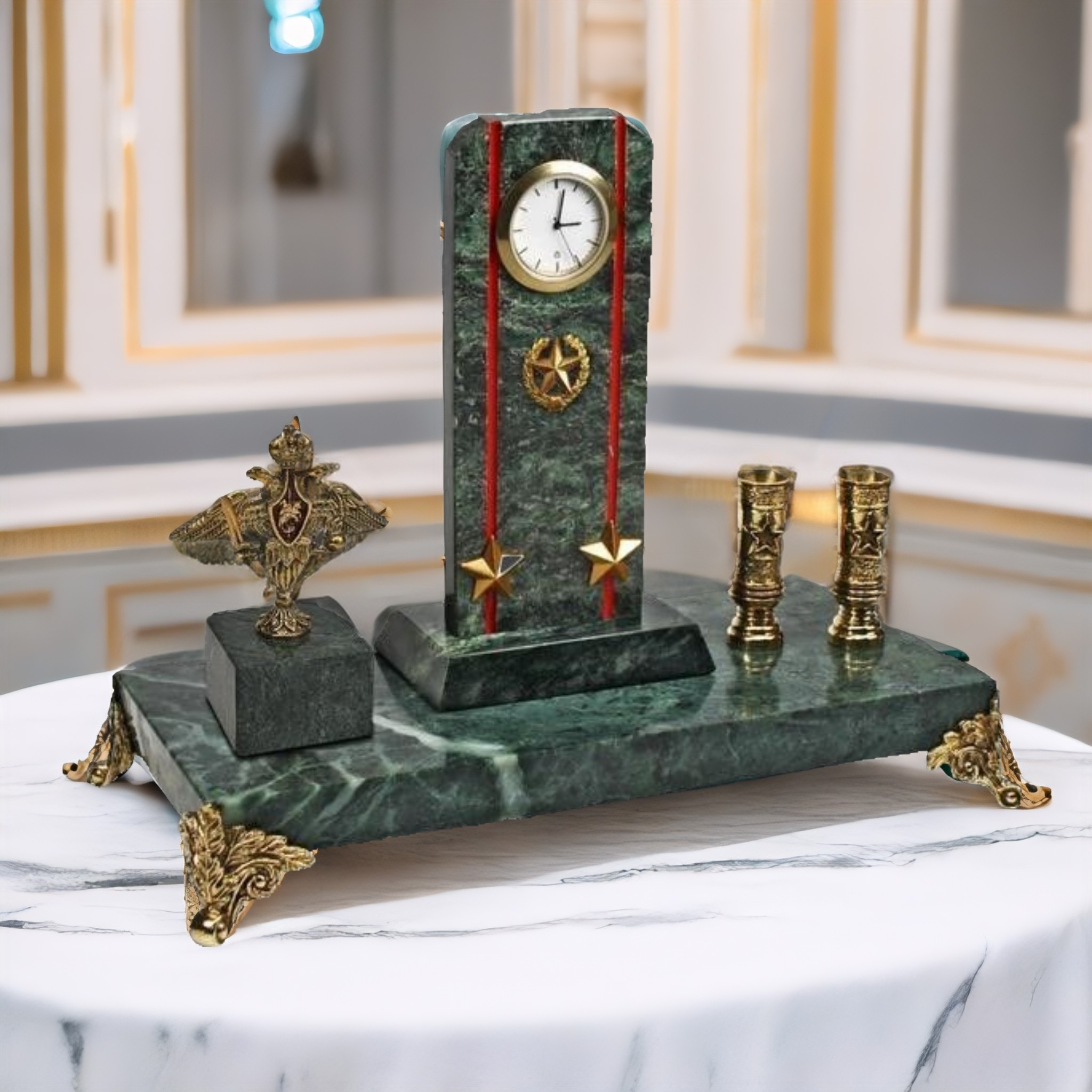 Удивительно элегантные и стильные, эти подарочные часы «Погон с п/п и гербом Сухопутных войск» сделаны из змеевика и бронзы. Уникальность продукта добавляется благодаря гербу Сухопутных войск России, который искусно отлит из бронзы. Стиль высших сил себя проявляет в каждом мелком детали этого изделия. Он поставляется с двумя подставками для ручек, и часы предназначены в форме погона, что соответствует всем военным стандартам.
