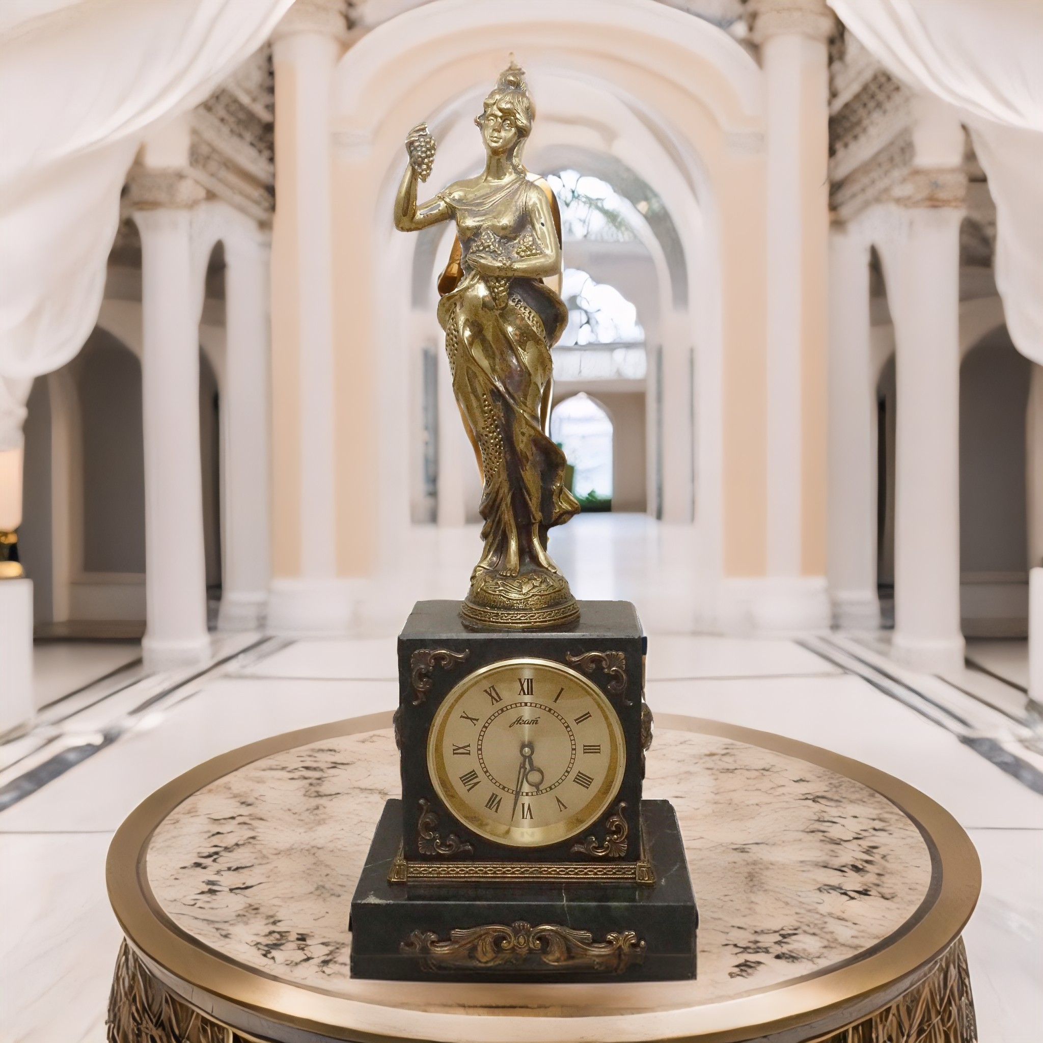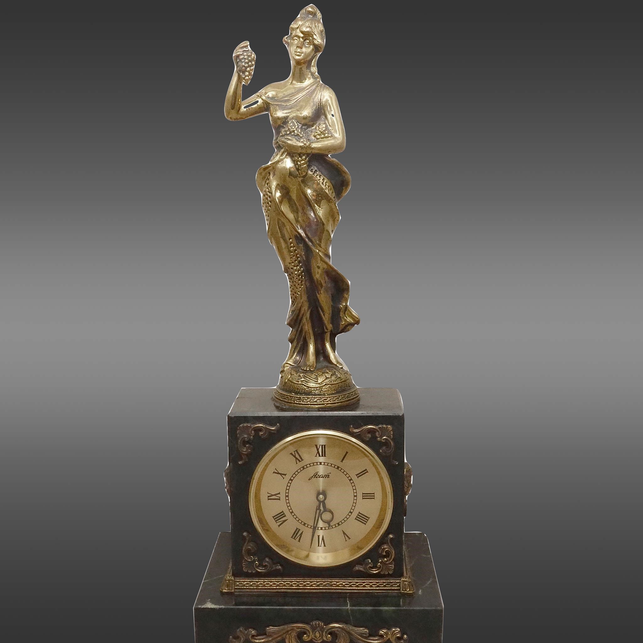 Представляем вашему вниманию не просто аксессуар, но истинное произведение искусства — настольные часы с фигуркой женщины из бронзы на циферблате из змеевика. Это изысканный подарок, который станет настоящим украшением интерьера любой комнаты. Тщательно проработанный дизайн объединяет в себе классическую элегантность и современные тенденции. Женская фигурка из бронзы придает часам особую изюминку, подчеркивая их уникальность и неординарность.