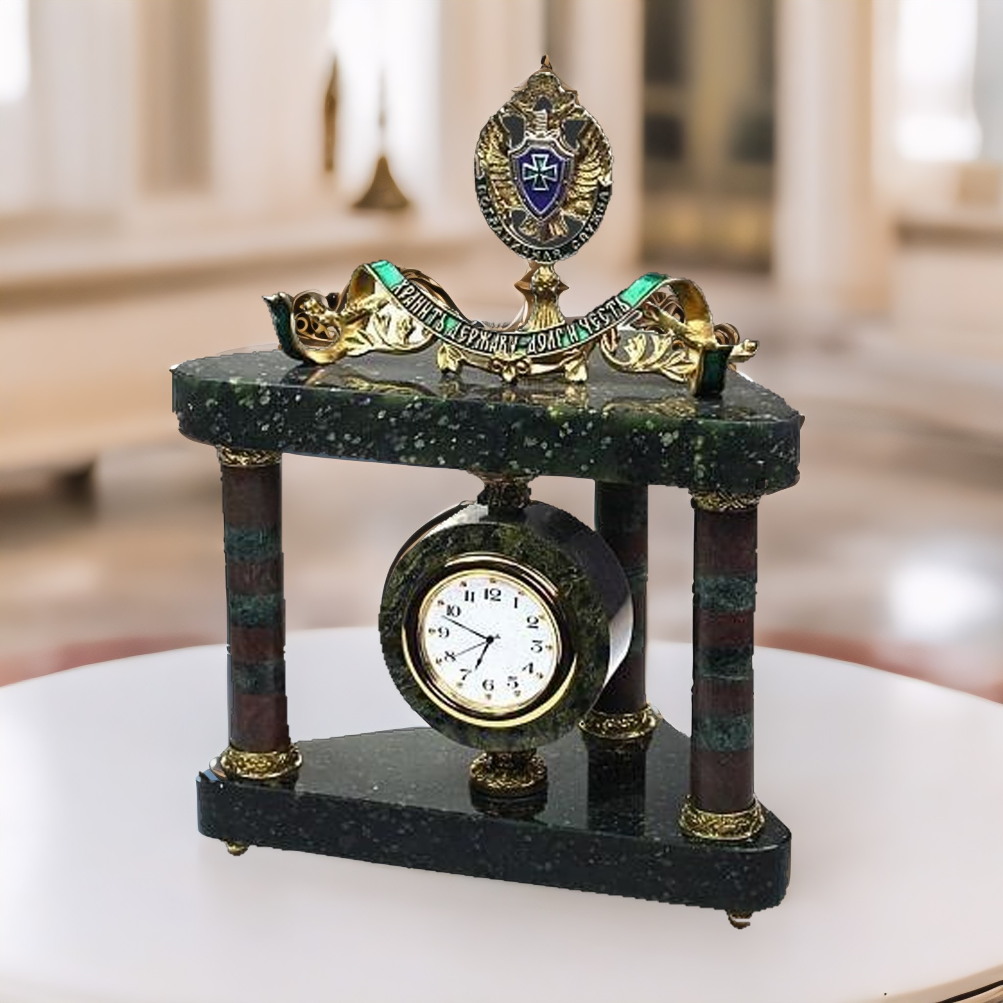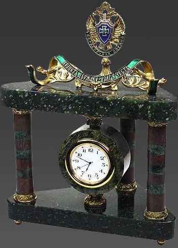 Представляем вашему вниманию не просто часы, но и стильное украшение рабочего стола — сувенирные настольные часы с гербом пограничной службы РФ. Это настоящий символ службы и преданности другу, коллеге или руководителю. Герметичный корпус изделия изготовлен из декоративного камня – змеевика, который придаёт часам особую прочность и надёжность. Герб Пограничной Службы Федеральной службы безопасности Российской Федерации выполнен из бронзы вручную мастерами ювелирного дела. Шикарное украшение и в то же время функциональный предмет — сувенирные настольные часы станут замечательным подарком.