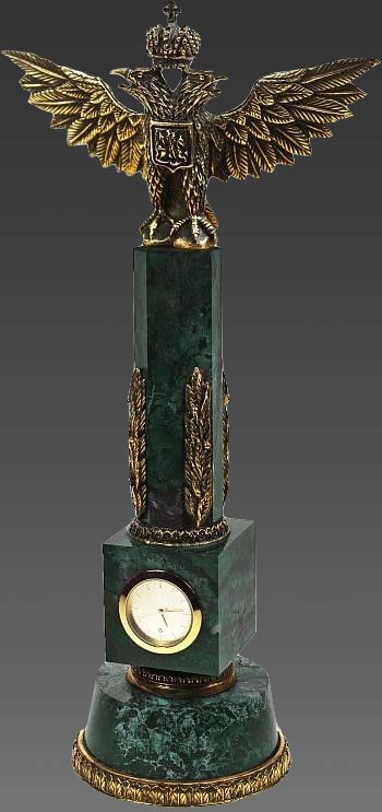 Представляем вашему вниманию уникальный сувенир — настольные часы из змеевика, украшенные фигуркой двухглавого орла из бронзы. Это отличный подарок для людей, ценящих красоту и элегантность в каждой детали своего интерьера. Двухглавый орел, выполненный из качественной бронзы, выглядит очень благородно и добавляет часам особенного шарма. Данный аксессуар станет настоящим бриллиантом в любой коллекции.