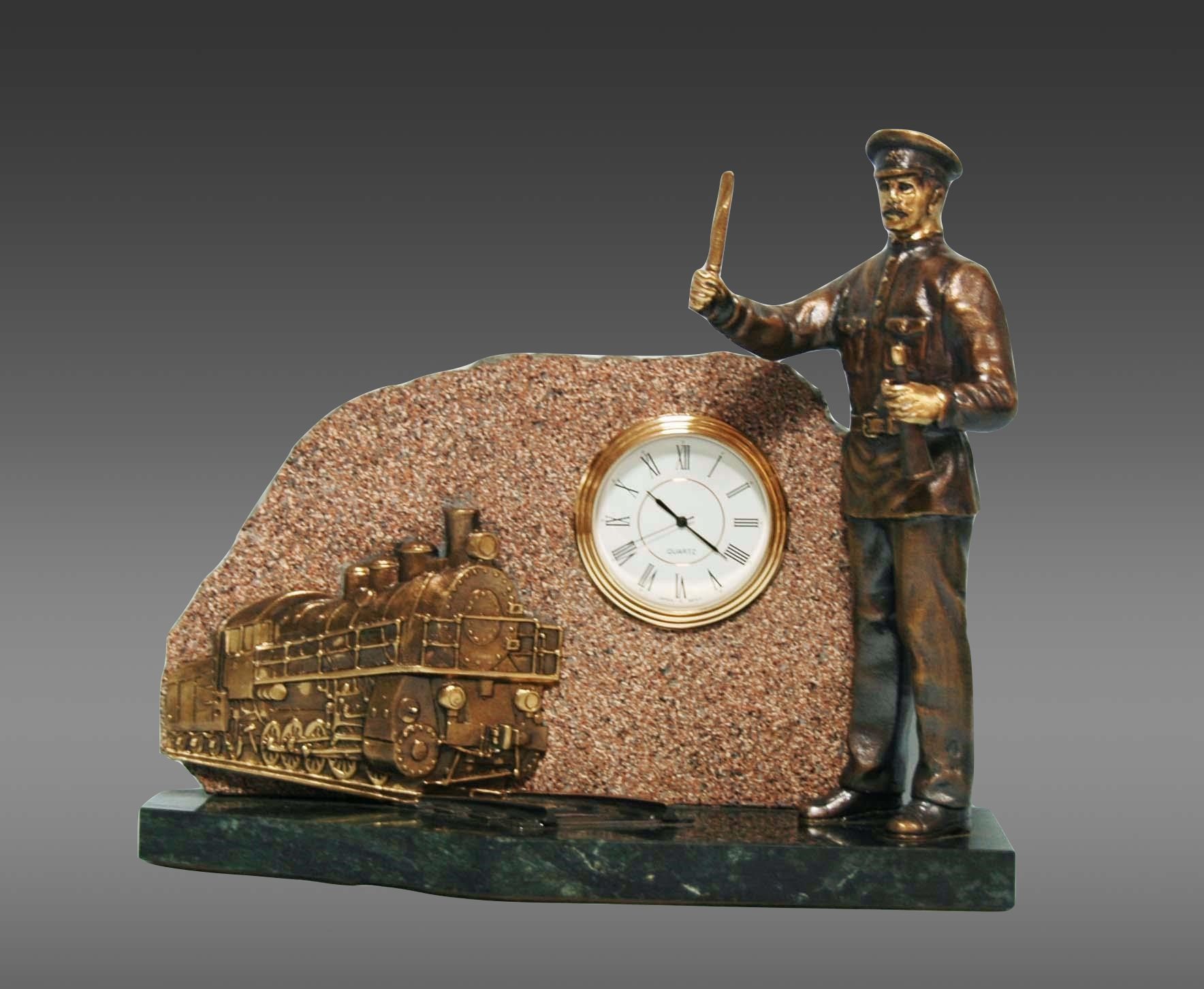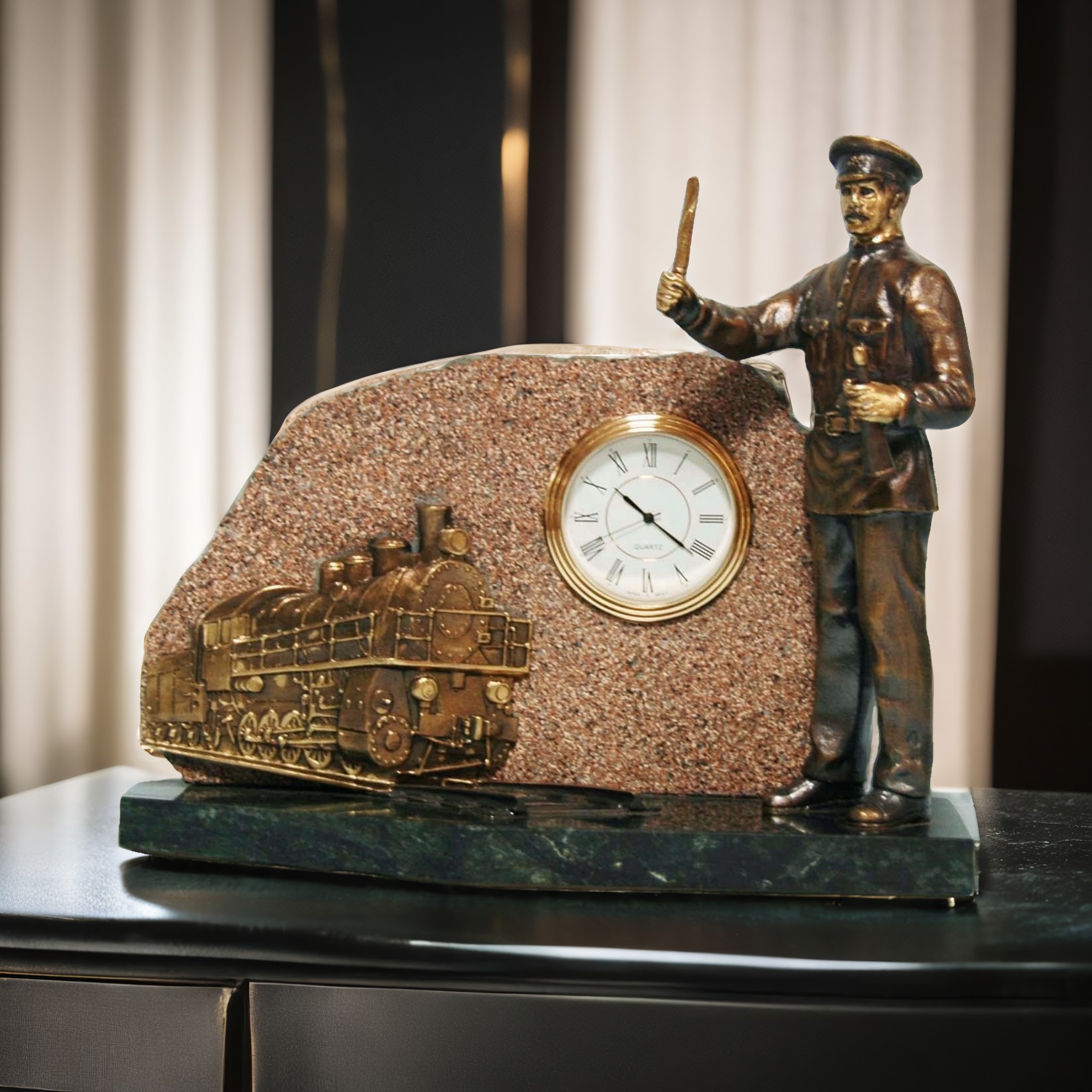 Путейщик из бронзы, вдохнувший жизнь в этот паровоз, сердцебиение которого отбивают минуты в вашем доме, приковывает взгляды своим мастерством и вниманием к деталям. Это идеальный подарок для тех, кто ценит уникальность и эксклюзивность. |