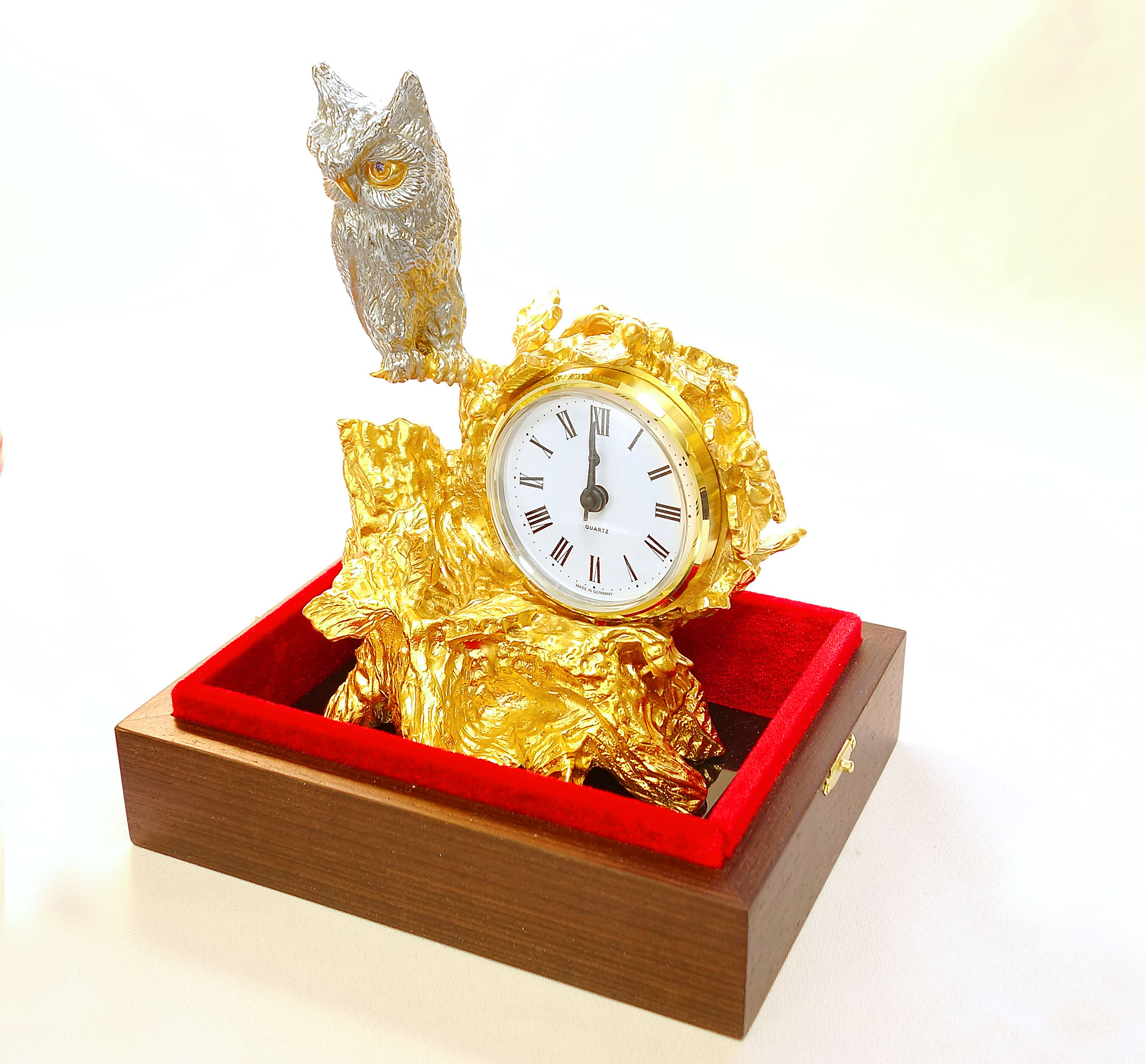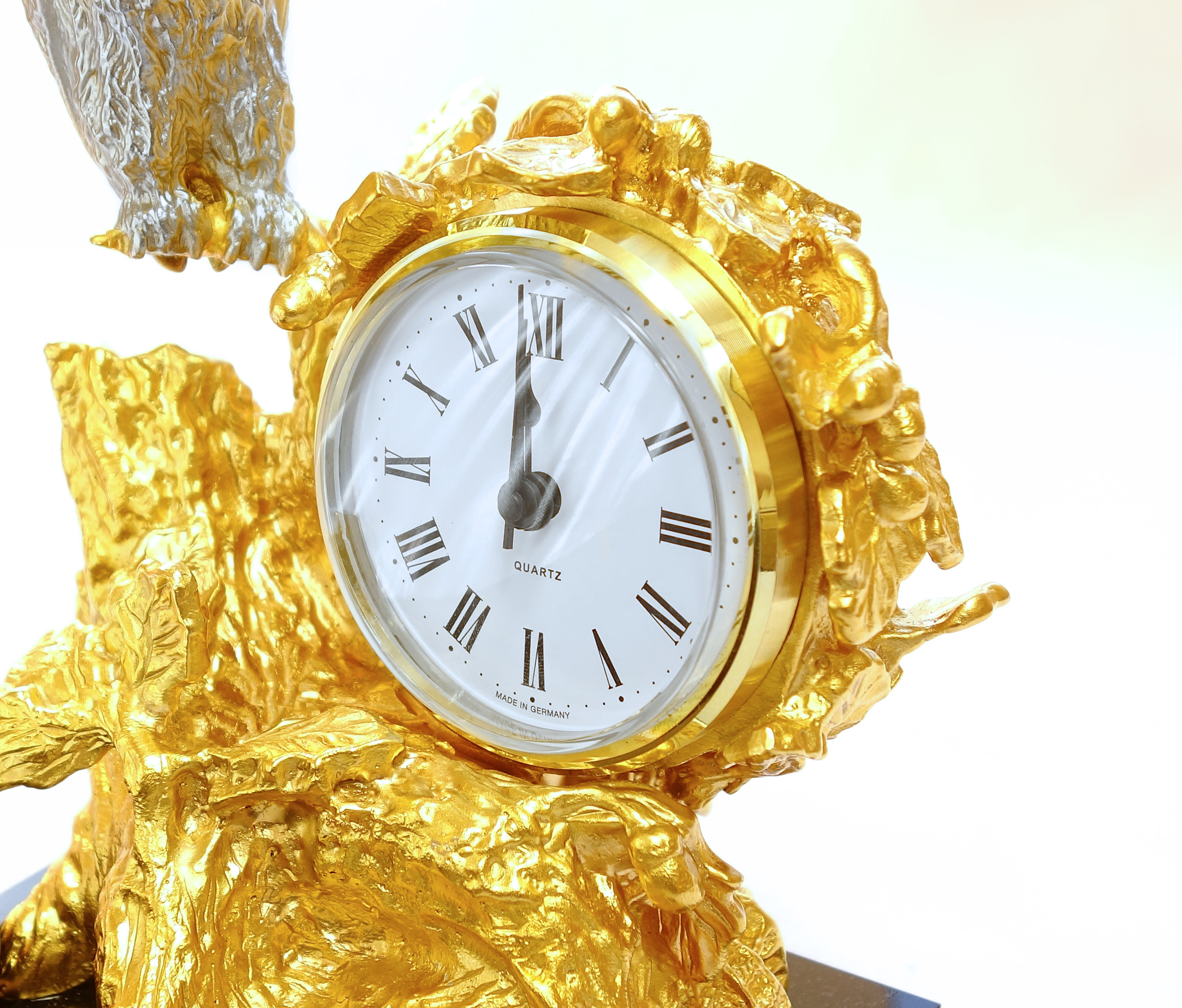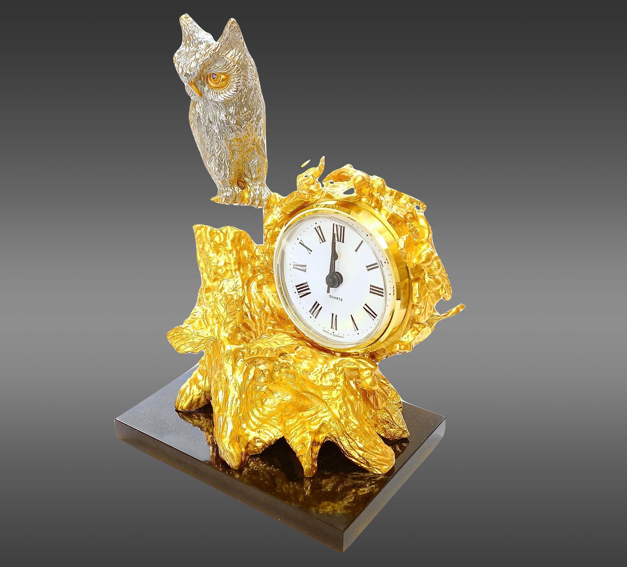 База часов сделана из долерита — это придает им уникальную элегантность и делает их выдающимся элементом любого интерьера. Не упустите возможность внести в свою жизнь нежный штрих роскоши с помощью наших бронзовых настольных часов с позолотой в виде статуэтки совы на дереве. |