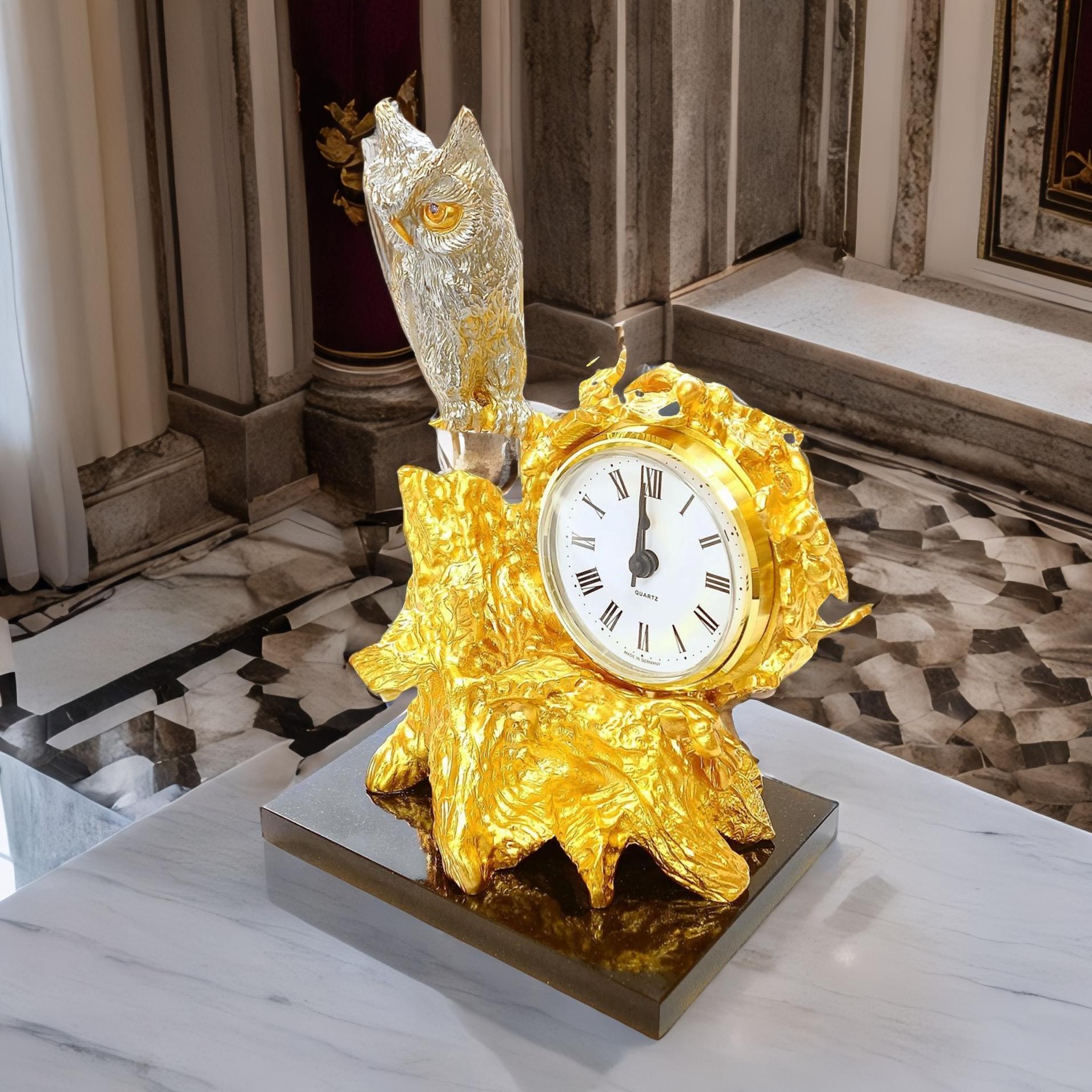 Раскройте чары истинной классики на вашем столе с помощью наших бронзовых настольных часов. Элегантно оформленные и ручной работы, эти часы являются чистым проявлением ремесленного искусства. Изящное позолоченное изображение совы на дереве добавляет этим настольным часам необходимого шарма и изысканности. Кроме того, высококачественная бронза обеспечивает долговечность и прочность, что делает эти часы идеальной покупкой на долгие годы.