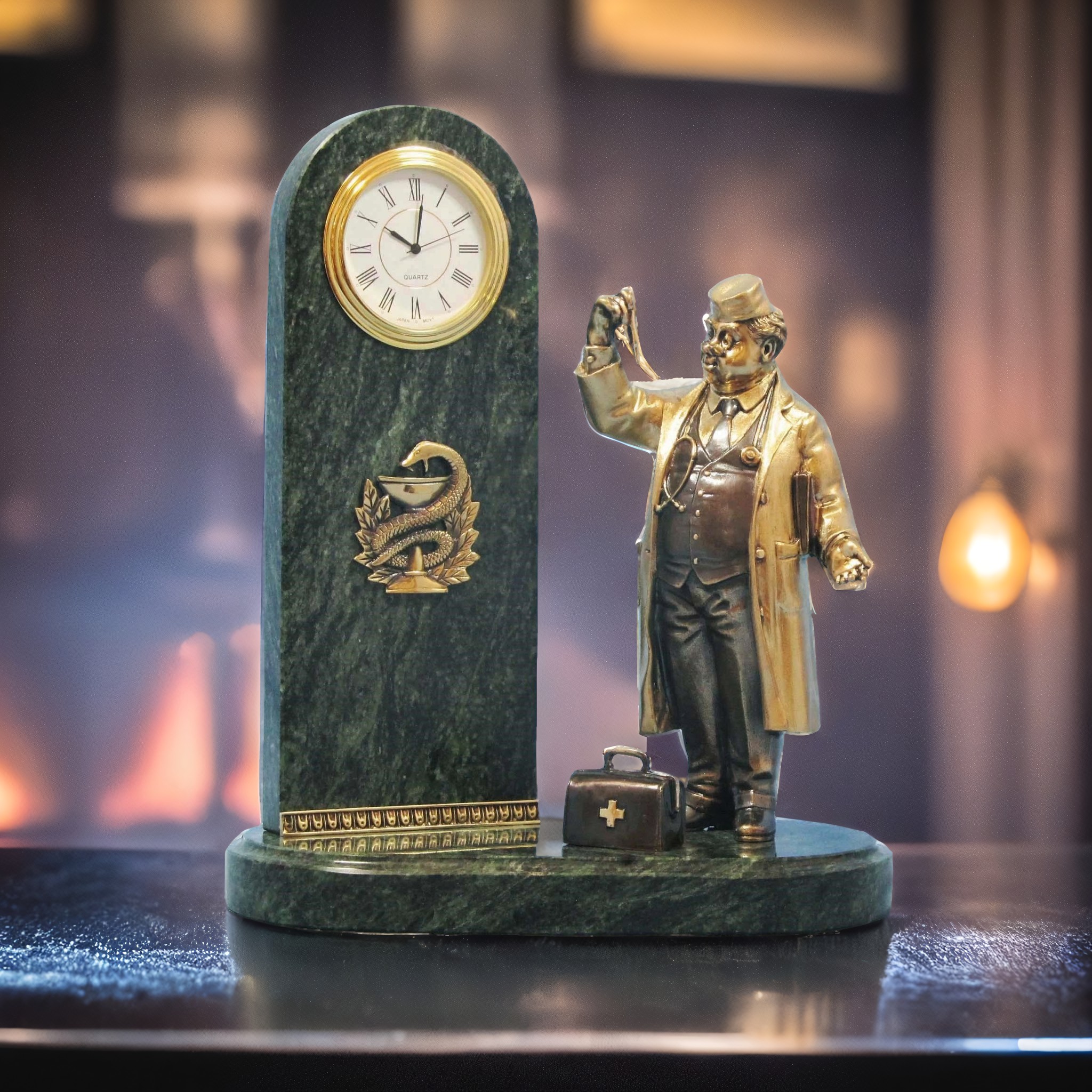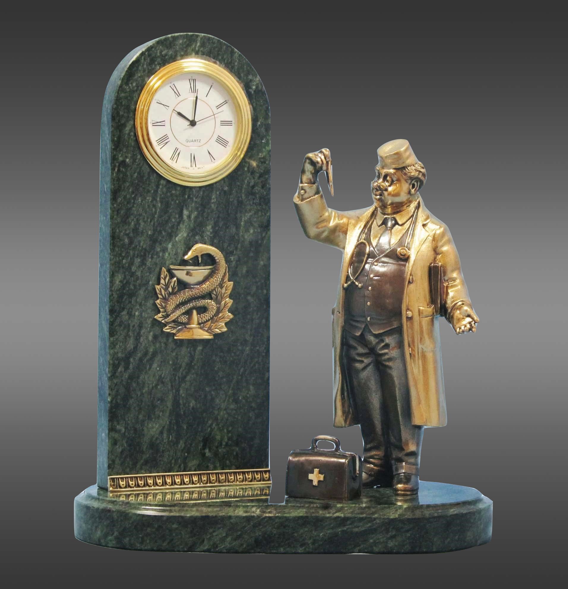 Мечтаете о подарке, который останется в памяти на всю жизнь? Тогда обратите внимание на эксклюзивные настольные часы из змеевика с бронзовой статуэткой доктора. Это не только практичный аксессуар, но и произведение искусства, которое украсит любой интерьер. Высокое качество и внимание к каждой детали — вот что отличает наши часы. Они выполнены из змеевика — уникального природного материала, а украшает их изящная фигурка доктора из бронзы. Индивидуальная ручная работа гарантирует, что каждый экземпляр уникален.